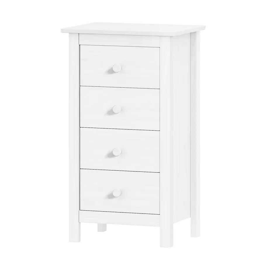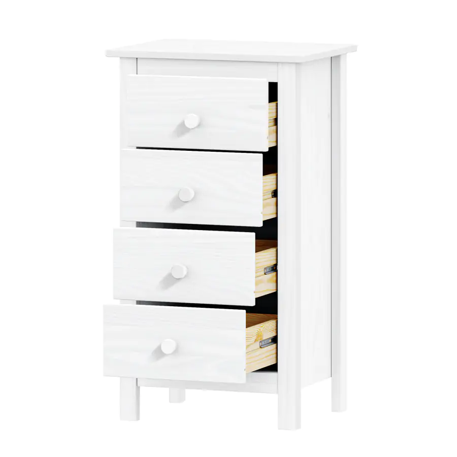 Komoda TORINO 4 zásuvky v barevném provedení bílá, krásně zapadne do každého moderně zařízeného pokoje. Stylová komoda obsahuje 4 zásuvky s kovovými pojezdy. Vyrobená z borovice masiv, v bílém lakovaném provedení. Komodu je možné doplnit i o další produkty z nábytkové řady Torino. Dodáváno v demontu. UPOZORNĚNÍ: bílý lak nezakrývá přirozenou kresbu a strukturu dřeva – ta zůstává po nalakování viditelná. Nejedná se o plně krycí nátěr, ale o povrchovou úpravu, která ponechává dřevu jeho charakter.
