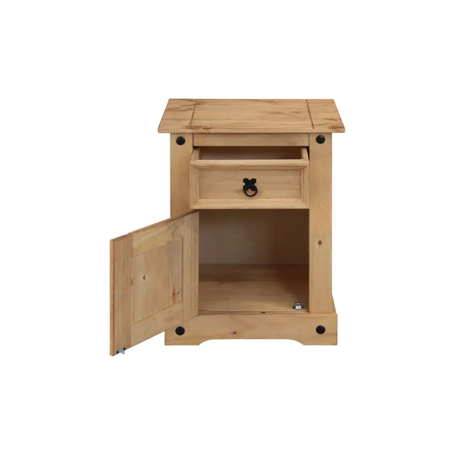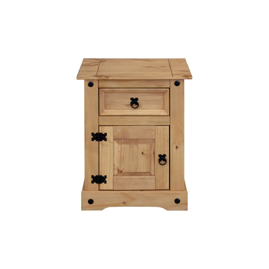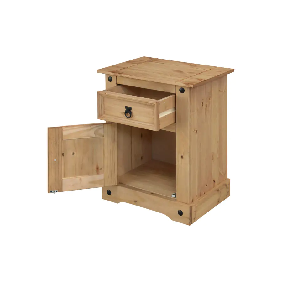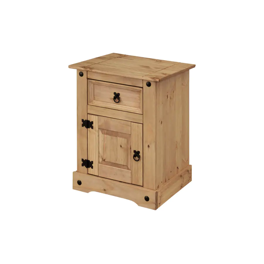Noční stolek CORONA 3, vyrobený z masivní borovice voskované v medovém odstínu, je vybavený jednou zásuvkou a jednou menší skříňkou. Panty u dvířek můžete namontovat tak, jak budete potřebovat. Tudíž je poté můžete otevírat i napravo i nalevo. Noční stolek CORONA 3 je vybavený kovovými ozdobnými úchytky. Stolek je možné doplnit i o další produkty z řady rustikálního nábytku Corona. Dodáváno v demontu.