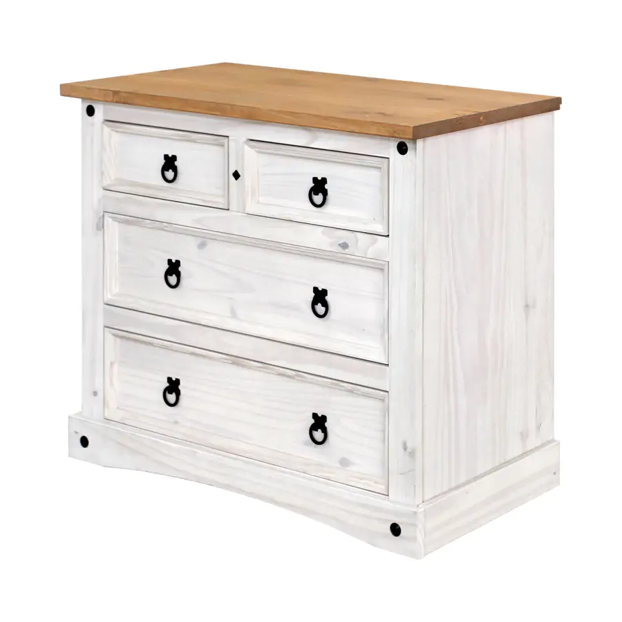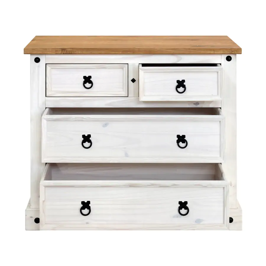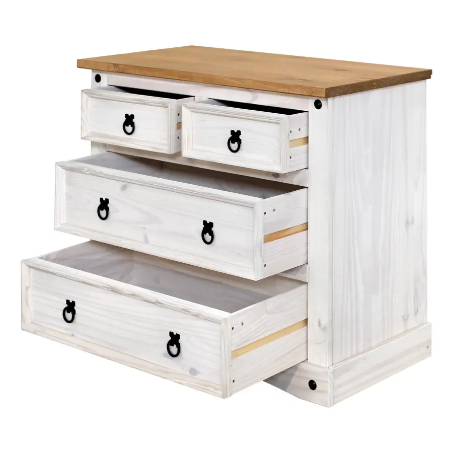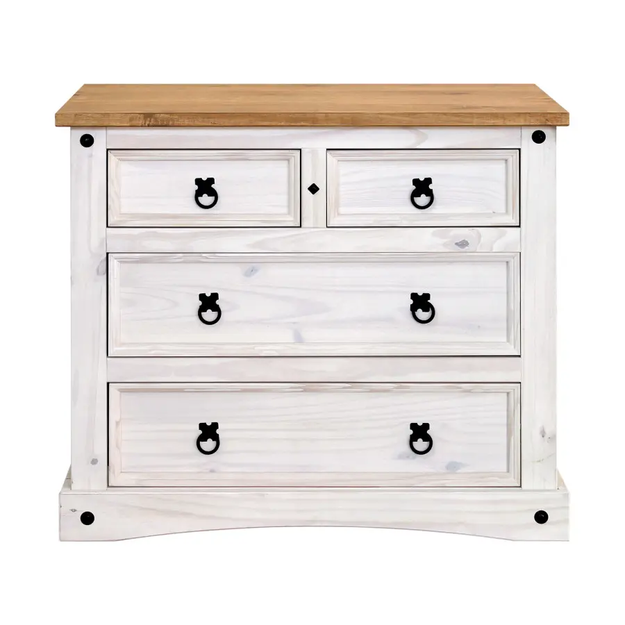 Komoda 2 + 2 zásuvky CORONA v provedení masiv borovice, voskovaná v bílém odstínu, se stane středobodem zájmu všech příchozích. Originální bílá komoda obsahuje čtyři zásuvky, do kterých uložíte nejrůznější drobnosti a dokumenty. Stylová masivní komoda poslouží nejen k uložení věcí, ale také k jejich vystavení. Bílá komoda je zdobena výraznými černými úchytkami, které tomuto kousku nábytku dávají nezaměnitelný vzhled.