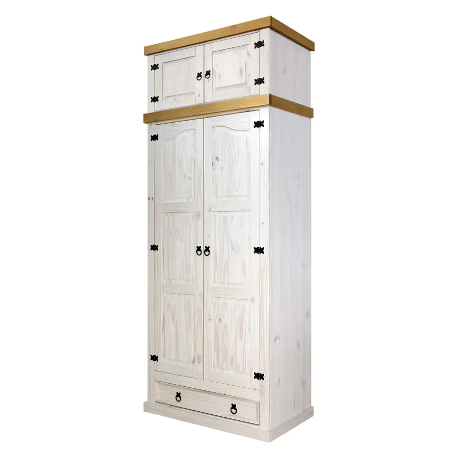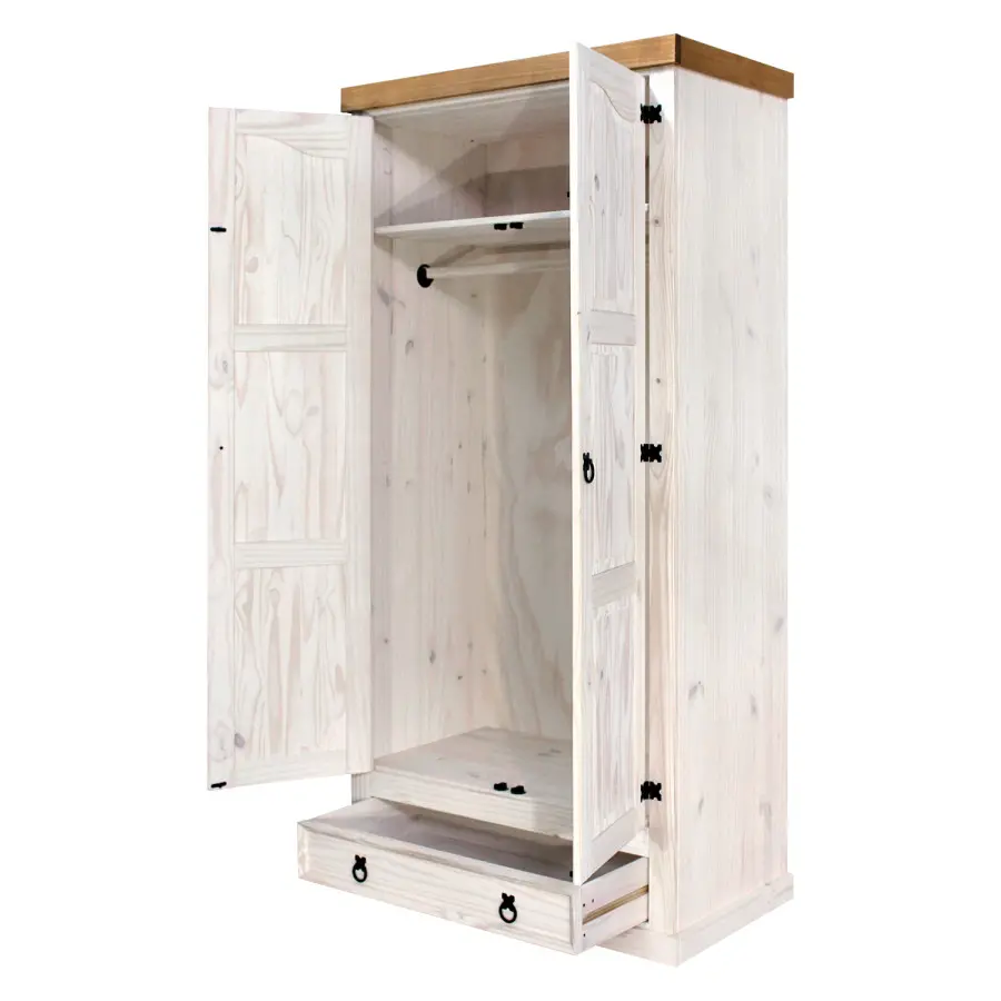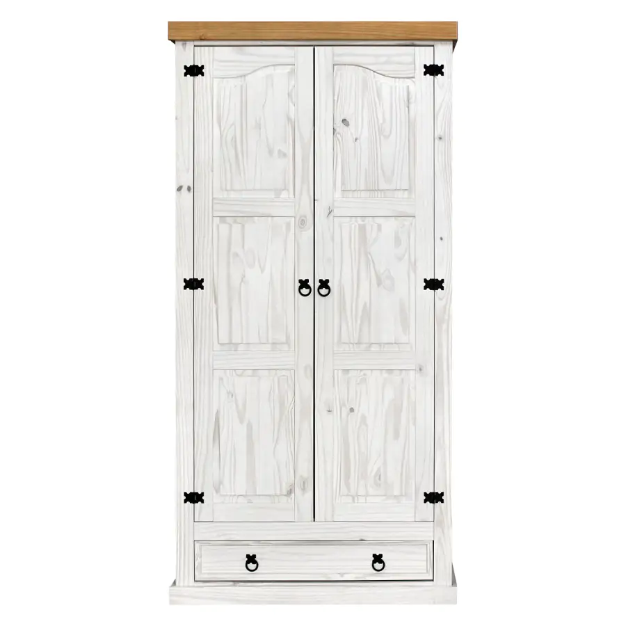 Skříň 2dveřová CORONA v provedení masiv borovice, voskovaná v bílém odstínu, s horní deskou voskovanou v medovém odstínu, bude skvělou volbou do ložnice, pokoje i šatny zařízené nábytkem CORONA v totožném barevném provedení. Skříň 2dveřová CORONA obsahuje šatní tyč a polici na klobouky, ve spodní části je velká zásuvka. Do praktické dvoudveřové skříně pověsíte všechno oblečení, na polici dáte doplňky a do zásuvky uložíte prádlo. Bílá skříň je zdobena černými s kovovými úchytkami a panty. Bílý masivní nábytek Corona v rustikálním designu vytvoří v každém prostoru dokonalou atmosféru.