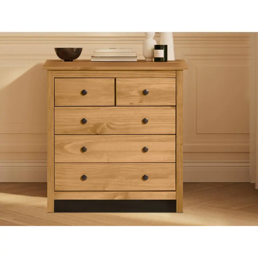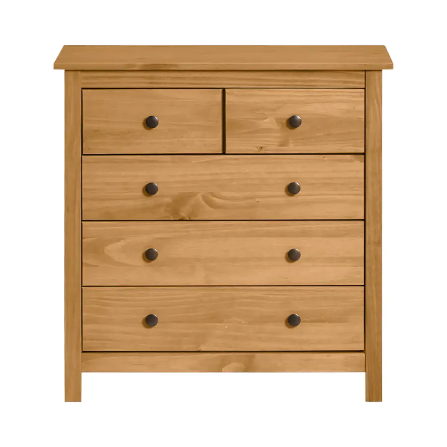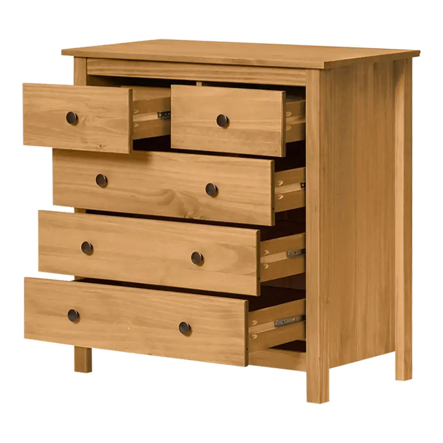 Každý pokoj, zařízený nábytkem v provedení voskované borovice v medovém odstínu, doplní praktickým úložným prostorem komoda se dvěma menšími a třemi většími zásuvkami ve stejném barevném provedení. Právě takovou vám nabízíme v řadě produktů TORINO. Do každé z menších zásuvek se vejde mnoho drobností. Do těch větších pak další i rozměrnější věci k uschování. Pro umístění všeho, co se do zásuvky prostě nevleze, pak můžete ještě využít i horní desku komody, kterou můžete ozdobit dekoracemi, fotografiemi či květinami.