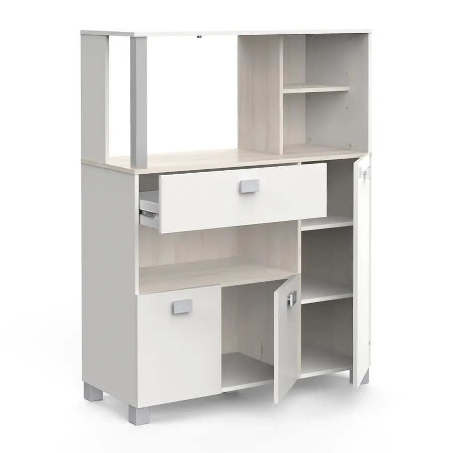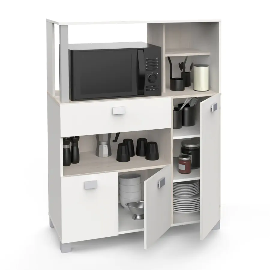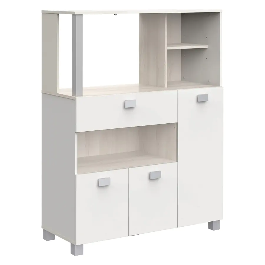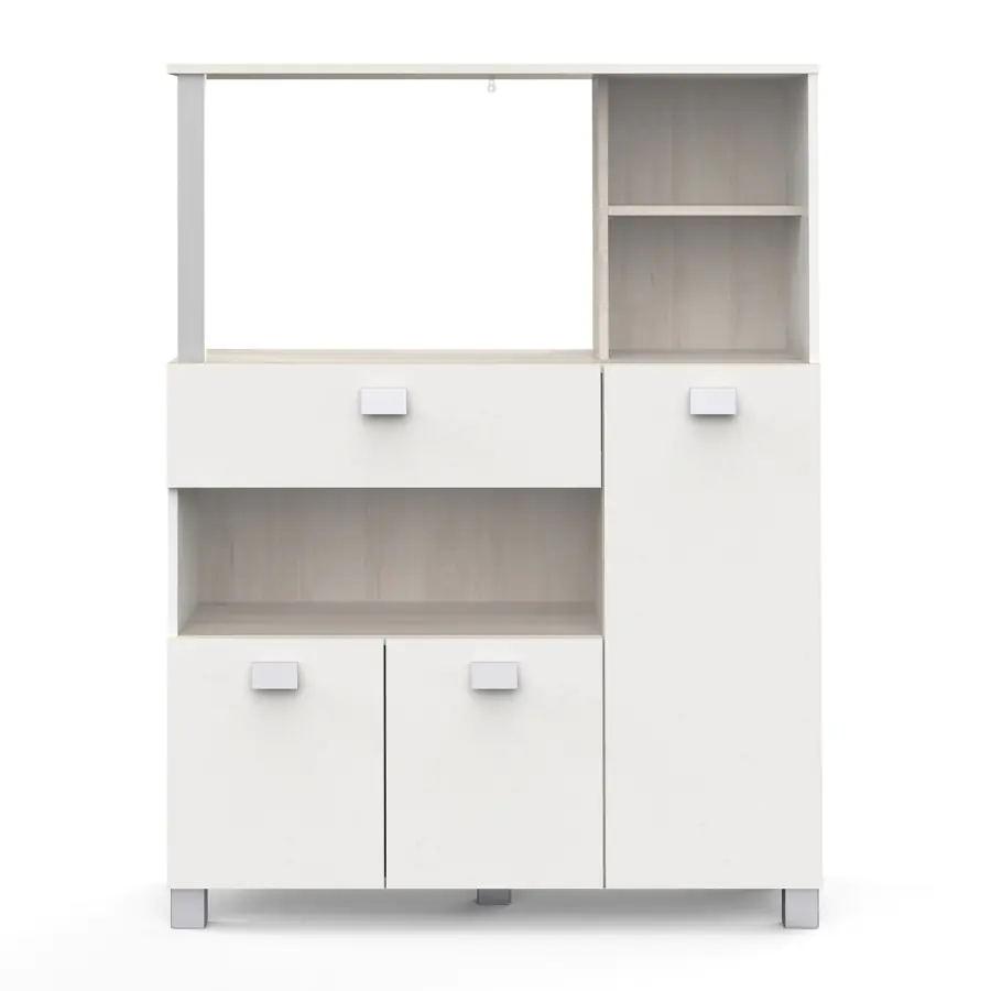 Skříňka na mikrovlnnou troubu vám nabídne šikovný úložný prostor. Skříňka obsahuje prostor pro mikrovlnnou troubu, pod kterým se nachází široká zásuvka na kuchyňské náčiní, příbory či jiné věci nezbytné k práci v kuchyni. Pod zásuvkou je další úložný prostor. Skříňka má troje dvířka. Je vyrobena z laminované dřevotřísky v dekoru akácie/bílá. Zásuvka má kovové pojezdy. Nosnost horní police na mikrovlnnou troubu: 15 kg Díky kolečkům skříňku snadno přemístíte. Dodávaná v demontu. Rozměry balení v demontu: š/v/d: 41 × 18 × 116 cm Prohlédněte si také naši nabídku jídelních setů a vylaďte svou kuchyni k dokonalosti.