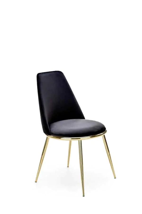 Designová jídelní židle K460 čalouněná oblíbenou sametovou látkou Velvet v elegantní černé barvě. Stabilitu židle zajišťuje kvalitní kovová konstrukce ve zlatém provedení. Dodávané v demontu. Prohlédněte si židle K460 i v jiných barevných provedeních. Moderní židle, která se hodí k námi nabízeným stolům.