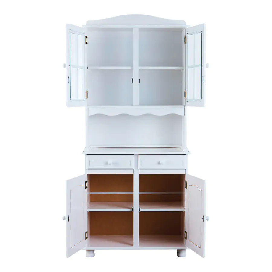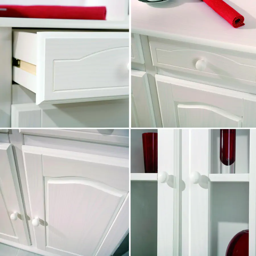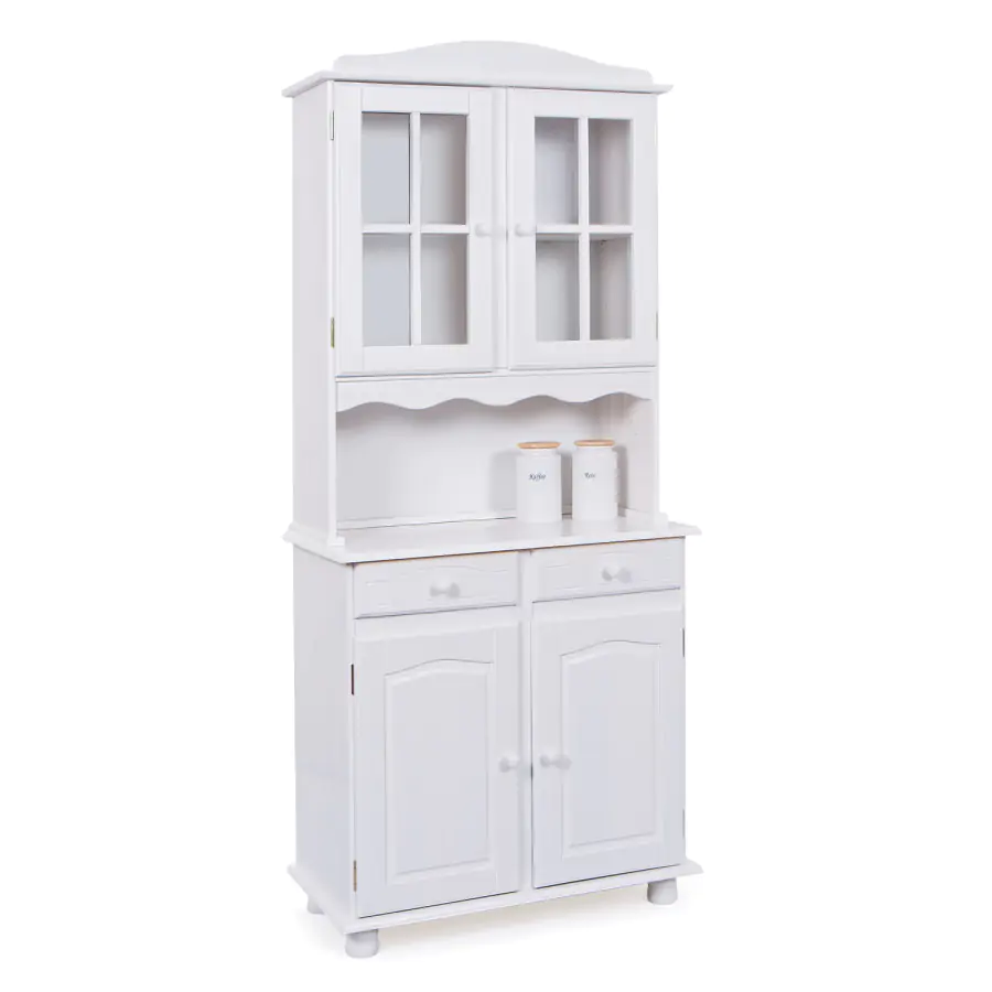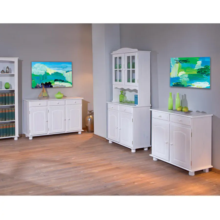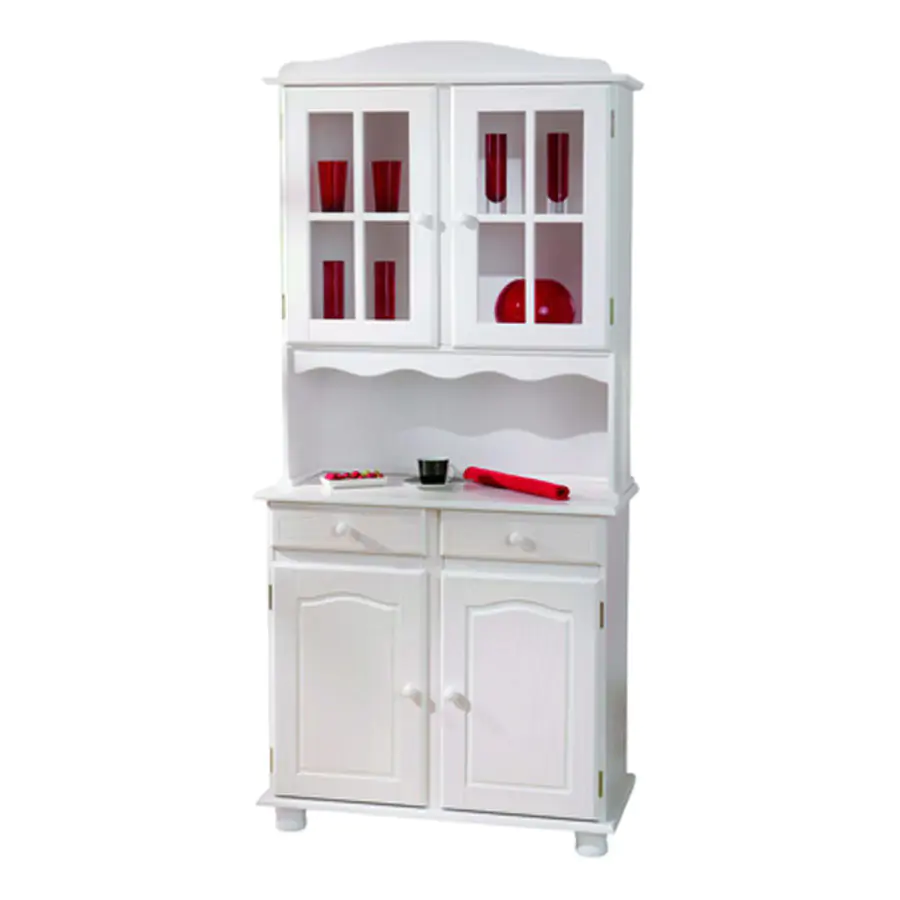 Příborník VALENCIA v bílé barvě krásně zesvětlí a zútulní vaši jídelnu či kuchyni. Je vyroben z masivní borovice a nabízí nejen spoustu úložného prostoru, ale i prostoru k vystavení krásného nádobí. Ve spodní čísti se nachází 2 plná dvířka a 2 zásuvky s kovovými pojezdy. Do skříňky lze uložit například hrnce či jiné nádobí, které nechcete, aby bylo na očích. Zásuvky můžete využít na uložení příborů či jiných drobností. Ve vrchní části jsou 2 prosklená dvířka, za kterými budou skvěle vypadat vaše nejluxusnější sady nádobí. Dodávaný v demontu. Prohlédněte si také naši nabídku kuchyňských doplňků.