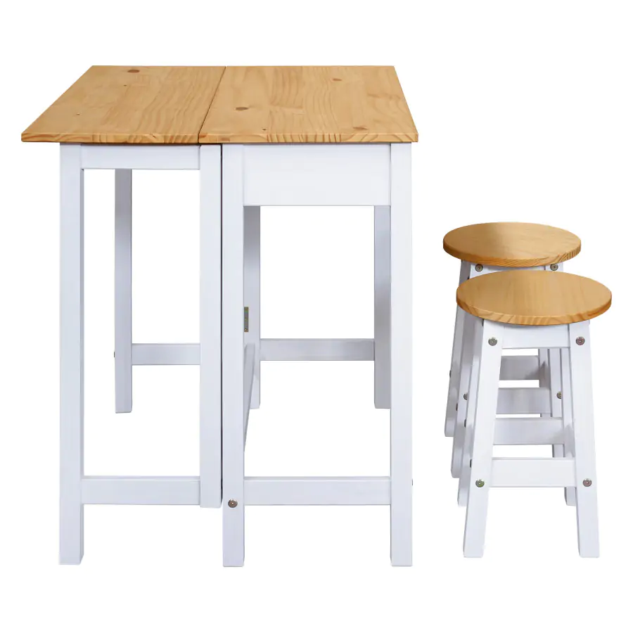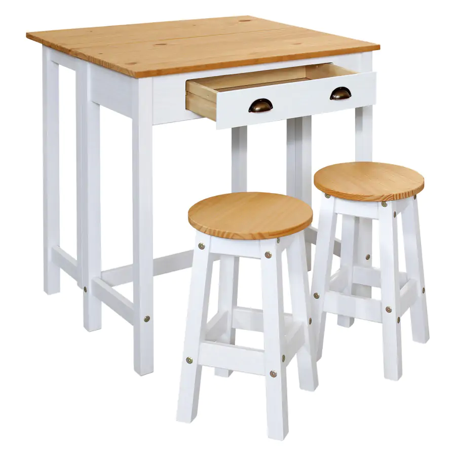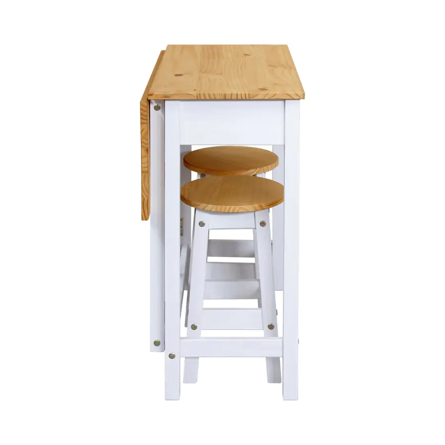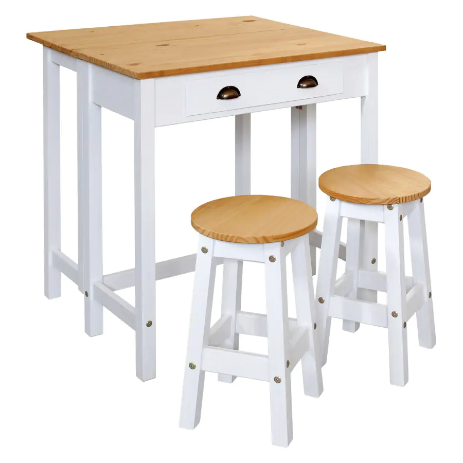 Praktická sestava TAPAS. materiál masiv borovice voskovaná v medovém odstínu a bílém odstínu skládací stůl se zásuvkou dvě barové židličky Rozměr složeného stolu (š/h/v) 80 × 42 × 84 cm - rozloženého stolu (š/h/v) 80 × 72 × 84 cm. Rozměr židličky (š/h/v) 30 × 30 × 51 cm. Dodáváno v demontu.