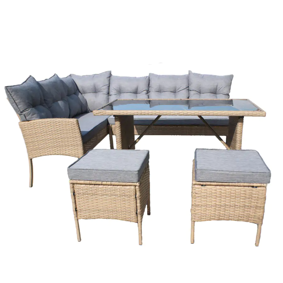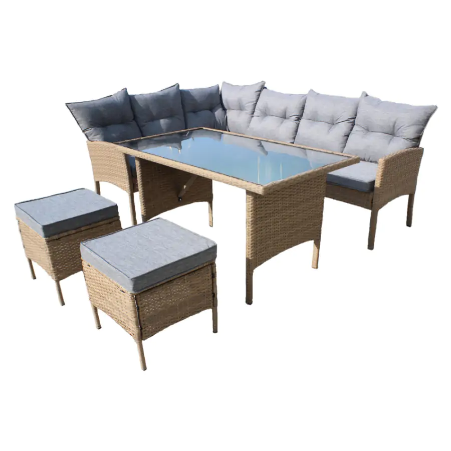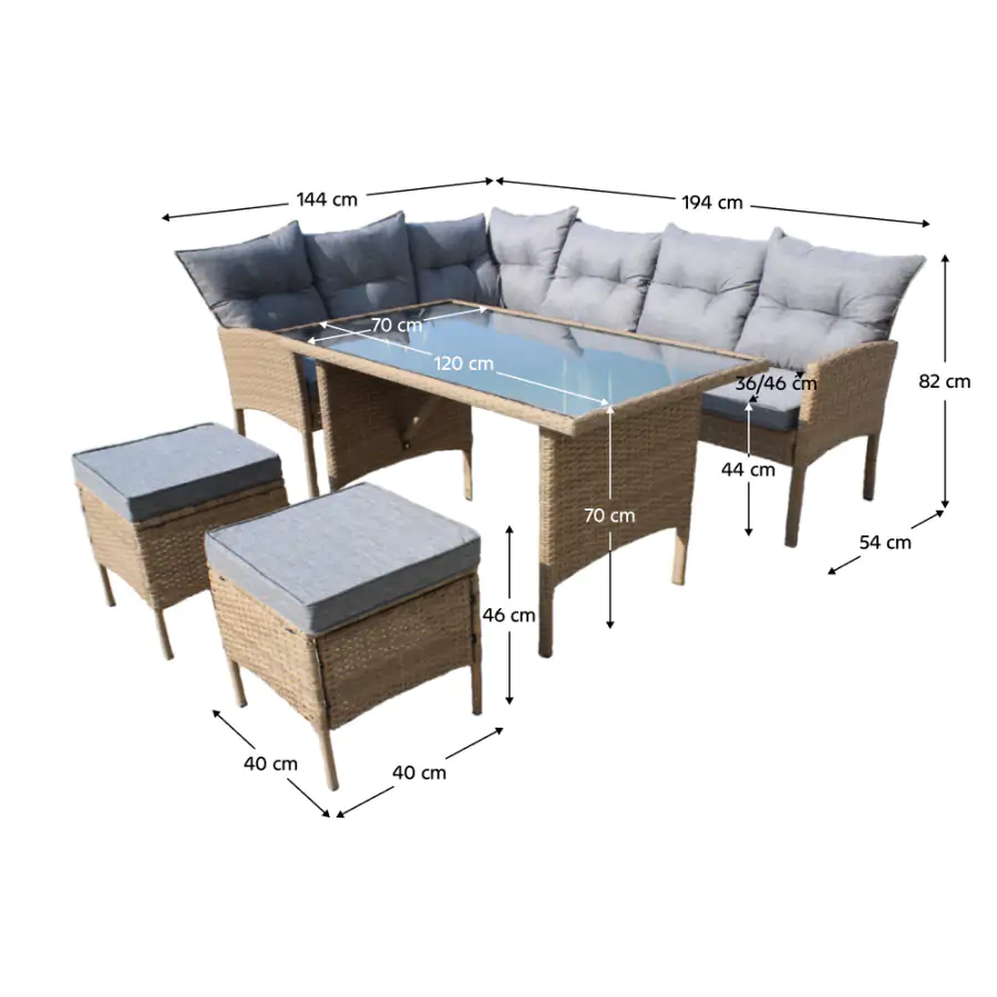 Stylové a komfortní, i takové může být venkovní posezení díky ratanovému setu RANDI! Umístit jej můžete do prostor zahrady, či pergoly. Set se skládá z rohové sedačky, dvou taburetů a jídelního stolu s deskou z tvrzeného skla. Konstrukce je tvořena pevným kovem s techno ratanem v přírodním odstínu. Komfort při sezení zajistí polštáře šedé barvy s voděodolným potahem. Rozměry rohové sedačky: 194/144x54x82 cm* Rozměry taburetu: 40x40x46 cm* Rozměry stolu: 120x70x70 cm* (*ŠxHxV) Dodáváno v demontu.
