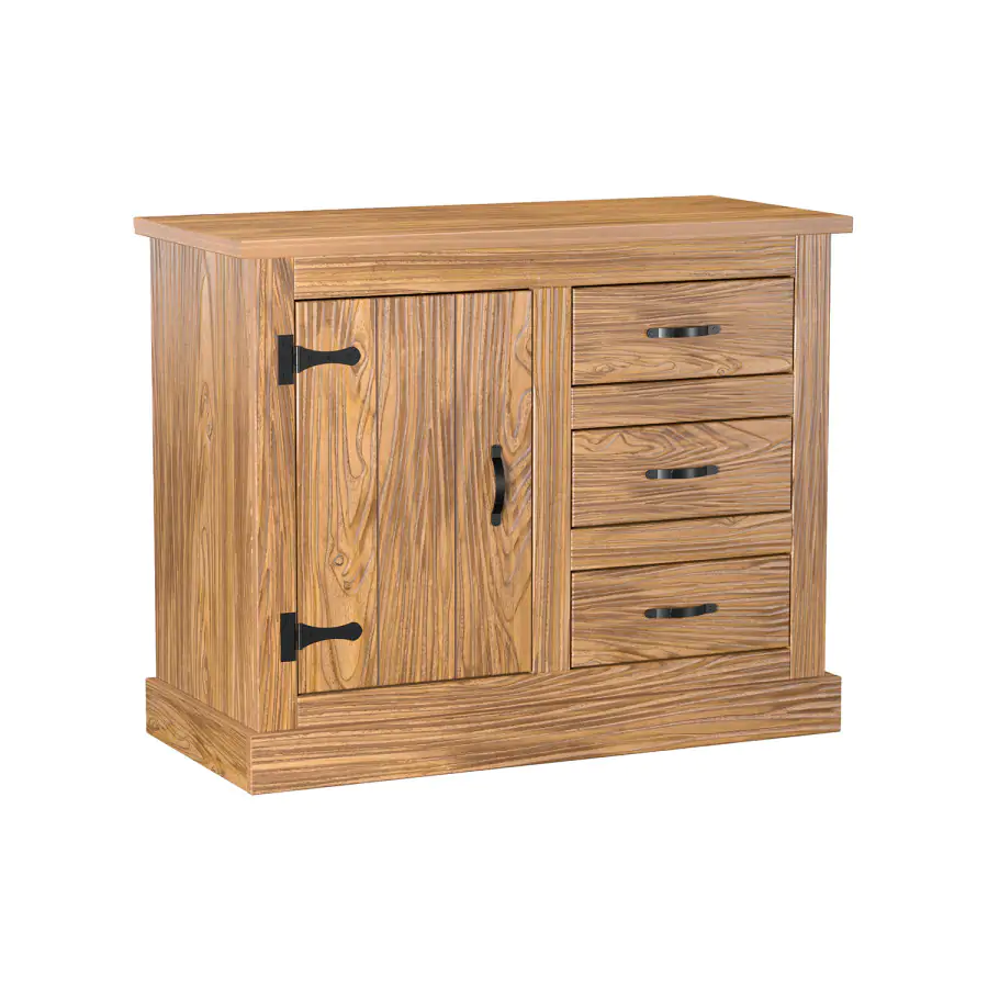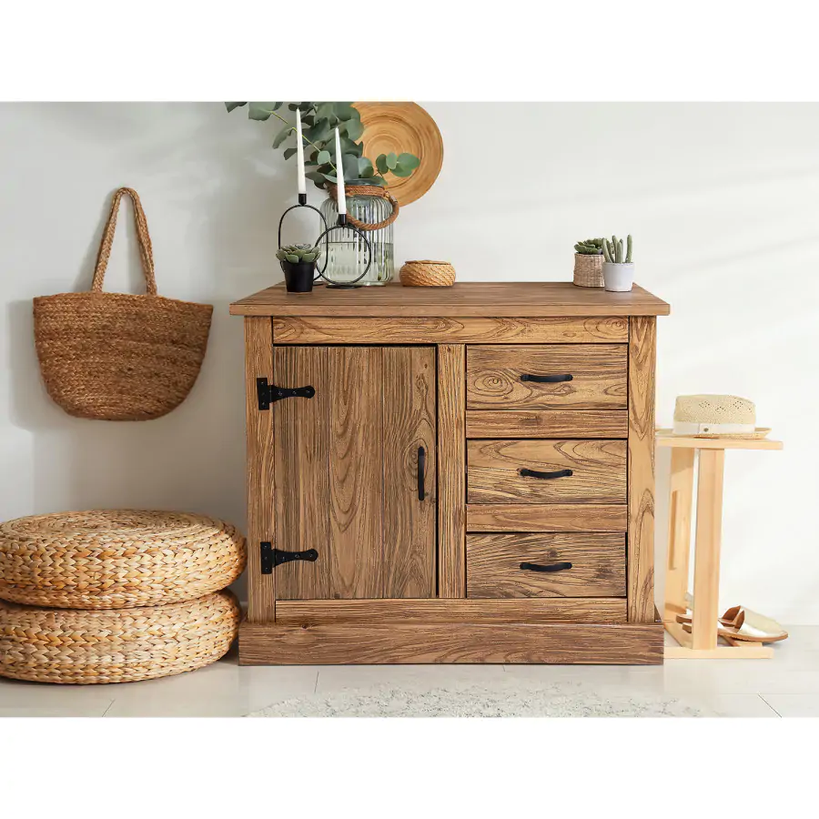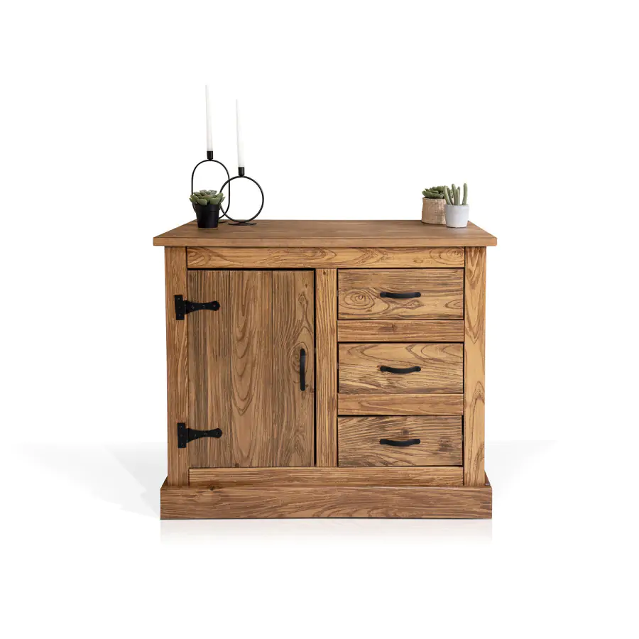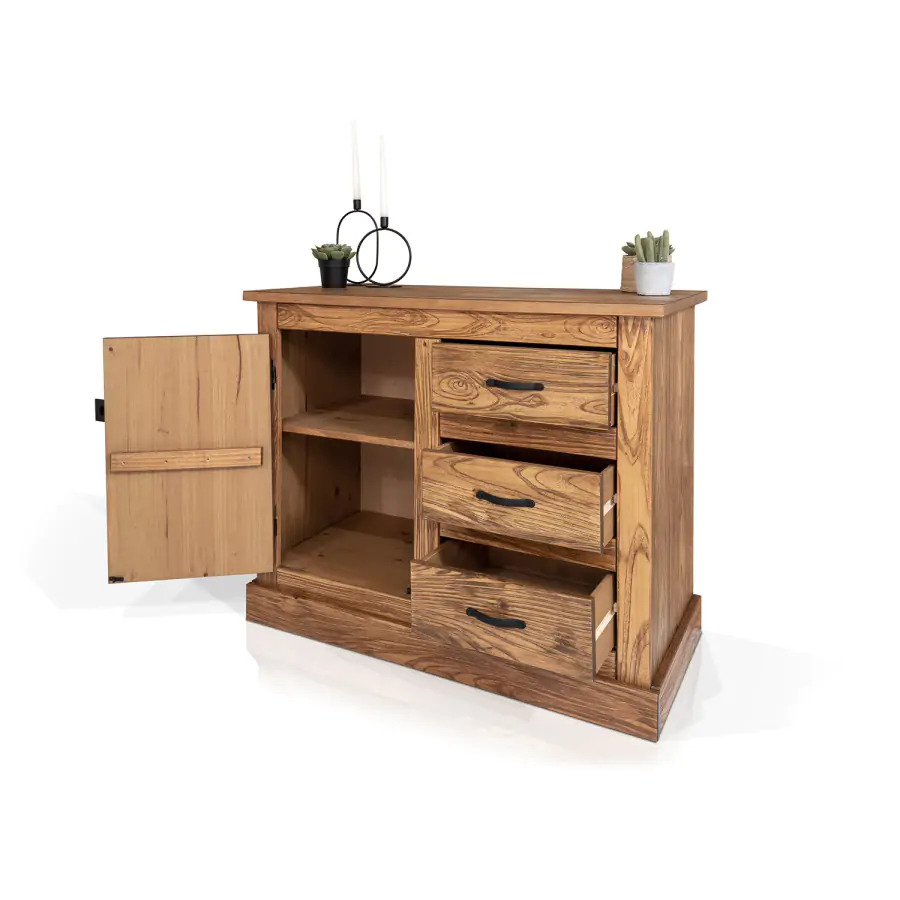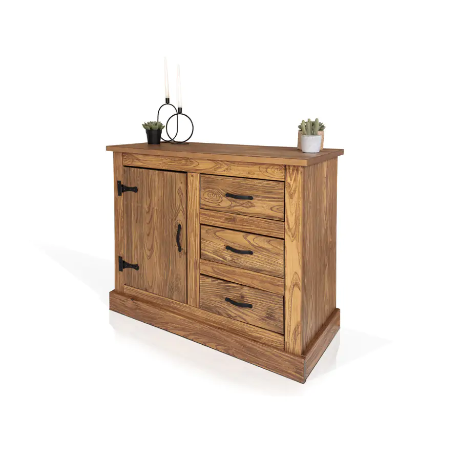 Komoda EL DORADO vkusně doplní interiér obývacího pokoje, předsíně, ložnice či jídelny! Minimalistické dřevěné provedení s černými prvky neomrzí ani po letech. Komoda je vyrobena z pevného borovicového masivu v dekoru dub antik s přiznaným vlisem. Dřevo je ošetřeno čirým lakem, který zajistí dlouhou životnost. Komoda disponuje úložným prostorem v podobě 1 skříňky, která je předělena policí a 3 šuplíky. Horní desku můžete využít k dekorativním účelům, či výstavě fotografií. Dodáváno v demontu.
