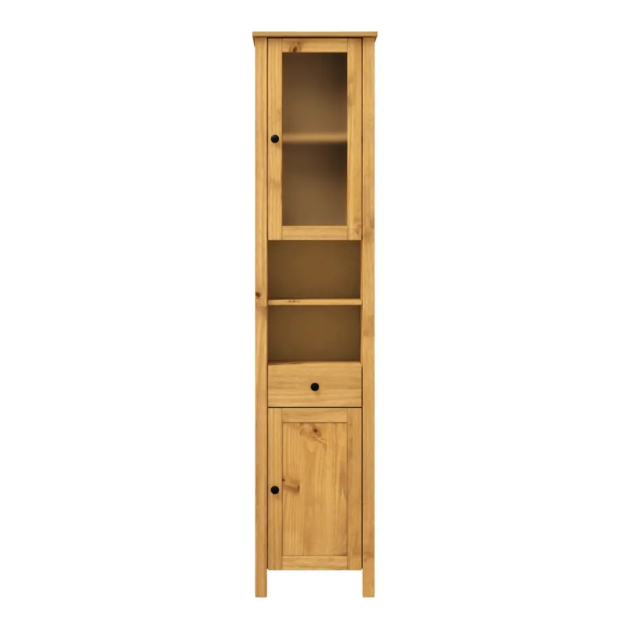 Kombinovaná vysoká skříňka PORTO v rustikálním stylu doplní interiér koupelny a zajistí dostatek úložného prostoru. Disponuje prosklenou a plnou částí s poličkami, 1 šuplíkem s kovovými pojezdy a otevřeným odkládacím prostorem. Vyrobena je z kvalitního borovicového masivu s voskováním, které dřevu zajistí dlouhou životnost. Skříňka je ideální k uskladnění kosmetiky, ručníků a dalších nezbytností, které jsou součástí koupelnové rutiny. Max. nosnost 1 poličky: 10 kg Max. nosnost šuplíku: 5 kg Povrchová úprava: voskování Dodáváno v demontu.