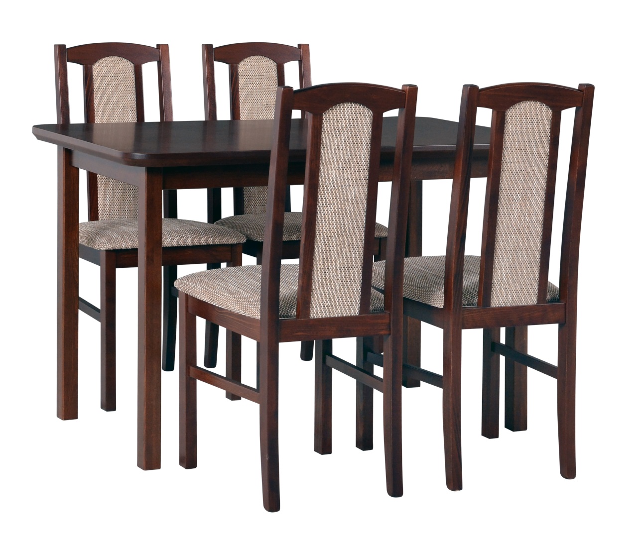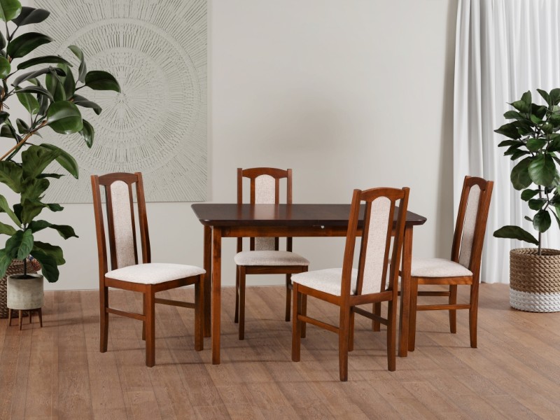 Jídelní set STRAKOŠ MA IV a B VII je vhodný pro 4-6 osob, je sestaven z rozkládacího stolu STRAKOŠ MA IV a 4 židlí STRAKOŠ B VII. Je možné si dokoupit libovolné množství židlí. Stůl STRAKOŠ MA IV je stůl rozkládací určený do restaurací, hotelů i domácností. Tento rozkládací stůl je pevný a stabilní. je v rozměrech, délka ve složeném stavu 120 cm a v rozloženém stavu je 150 cm, šířka stolu 70 cm a výška stolu je 76 cm. Konstrukce stolu je vyrobena z bukového dřeva a deska stolu z dýhy. Stůl má obdélníkový tvar se zakulacenými rohy. Židle STRAKOŠ B VII je židle do restaurací, hotelů i domácností. Je velice pevná a také přiměřeně lehká cca 5 kg. Tato židle je v rozměrech, výška opěradla 96 cm, výška sedací plochy židle je 47 cm, hloubka je 40 cm, šířka židle je 43 cm. Židle B VII je vyrobena z masívu bukového dřeva. Jídelní set Vám umíme dodat v libovolné barevné kombinaci dle dostupných variant. Zobrazení barev se může lišit dle nastavení Vašeho elektronického zařízení a není důvodem k reklamaci. Set je dodáván v celku, pouze nohy stolu jsou demontovány.