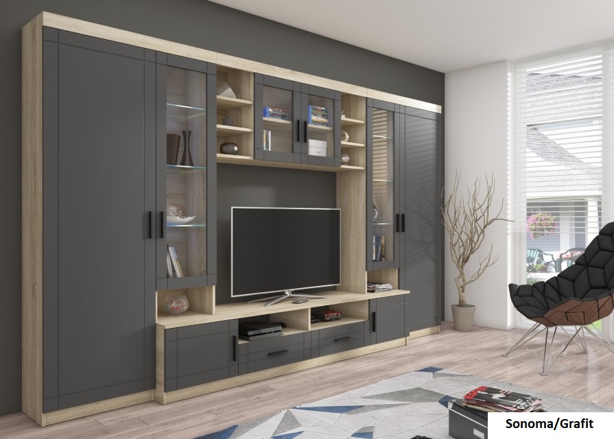 OBÝVACÍ STĚNA STRAKOŠ PARObývací stěna STRAKOŠ PAR je kompaktní a díky svým rozměrům se hodí spíše do větších pokojů. Nechybí praktické úložné prostory a otevřené přihrádky. Dodá Vašemu pokoji moderní a svěží vzhled. Sestava nabízí širokou škálu barevného provedení, které vynikne v každém interiéru. Skleněné části dodávají kouzlo a oživují celkový vzhled stěny. LED osvětlení, které podtrhne eleganci a celkový vzhled, je možno dokoupit za příplatek. Skládá se ze 4 prvků s možností dokoupení komody v různých variantách. Konstrukce je vyrobena z vrstvené dřevotřískové laminátové desky (LTD) o tloušťce 15 mm v dekoru dřeva v kombinaci se sklem tloušťky 4 mm, melaminovými hranami. Konstrukce zadní části je tvořena HDF deskou. Nožky a úchyty jsou z plastového materiálu ve stříbrné nebo černé barvě dle typu barevného provedení obývací stěny.Rozměry celé sestavy: šířka 340 cm, výška 197,50 cm, hloubka 44 cm.Je navržena ve 3 barevných provedení, na výběr máte:1) Sonoma / Bílá mat2) Sonoma / Grafit 3) SonomaSESTAVA SE SKLÁDÁ Z NÁSLEDUJÍCÍCH DÍLŮ:1) TV BOX v rozměrech: výška 44 cm, šířka 220 cm, hloubka 43,40 cm2) SKŘÍŇ VELKÁ v rozměrech: výška 197 cm, šířka 100 cm, hloubka 33,60 cm3) SKŘÍŇ VELKÁ v rozměrech: výška 197 cm, šířka 100 cm, hloubka 33,60 cm4) SKŘÍŇ ZÁVĚSNÁ v rozměrech: výška 63 cm, šířka 140 cm, hloubka 33,60 cmPrvky této obývací stěny nelze zakoupit samostatně. K obývací stěně si můžete dokoupit různé varianty komod, které naleznete zde: 1) KOMODA STRAKOŠ PAR 2F2S2) KOMODA STRAKOŠ PAR 3F3SINFORMACE O BALENÍ:Sestava dodávána v demontu (rozloženém stavu)Součástí je montážní návod včetně potřebných spojovacích materiálůCelkový počet balíků - 8 ksHmotnost - 202,50 kgÚDRŽBA:Sestava je z laminovaného dřevotřískového materiálu, který je odolný a nenáročný na údržbu. Nábytek otírejte hadříkem navlhčeným šetrným a k tomu určeným čistícím prostředkem.