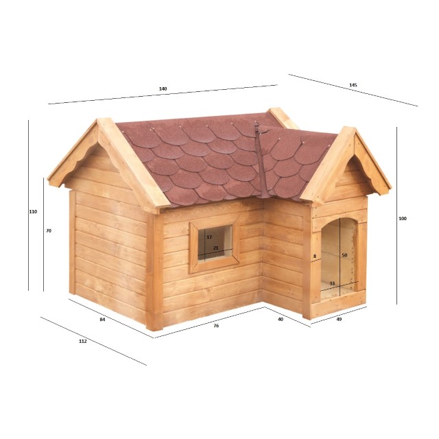Psí bouda STRAKOŠ MO 141 je prostorná bouda vhodná pro plemena velkých psů. Prostor je členěný na předsíňku a ložnici s oknem. Bouda je zateplená kompletně polystyrenem, včetně podlahy. Vyrobená je z masivu smrkového dřeva, lakovaná kvalitním ekologickým lakem a opatřena střešní krytinou. Bouda se vyznačuje velice kvalitním zpracováním a použitím prvotřídních materiálů. Rozměr: výška 110 cm, šířka 140 cm, hloubka 145 cm