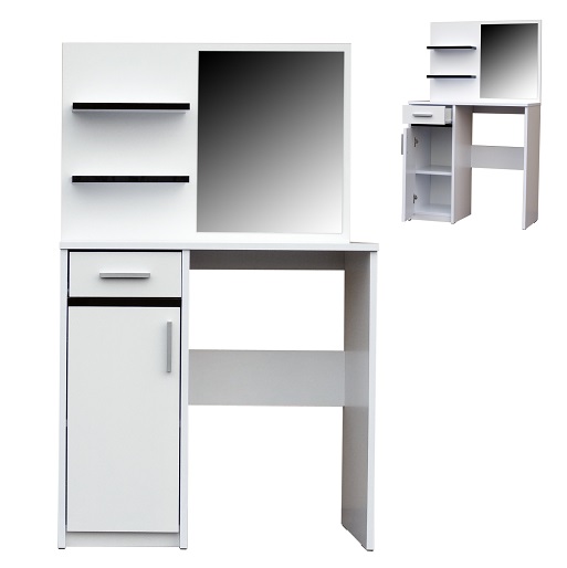 Kosmetický stolek STRAKOŠ AT 740Kosmetický stolek STRAKOŠ AT 740 je určen k vybavení ložnic, pokojů, ale i hotelových pokojů. Tento kosmetický stolek je vyroben z laminované desky. Součástí stolku je zrcadlo, dvě otevřené police, šuplík a skříňka s policí. Na výběr máte ze dvou modelů. Hliníková lišta dodává zboží eleganci a jedinečný vzhled.Rozměry stolku: výška 132 cm, šířka 80 cm, hloubka 36 cm.Zobrazení barev se může lišit dle nastavení Vašeho elektronického zařízení a není důvodem k reklamaci.Kosmetický stolek je dodáván v demontu, montáž je jednoduchá dle přiloženého plánku.