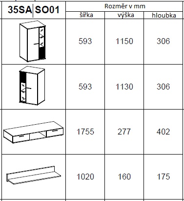 OBÝVACÍ STĚNA STRAKOŠ SAL - LAMELObývací stěna STRAKOŠ SAL je zajímavá svým vzhledem, kvalitou zpracování a v neposlední řadě spoustou úložného prostoru. Díky svým rozměrům je vhodná do menších, tak i prostornějších prostorů. Skleněné části dodávají kouzlo a oživují celkový vzhled stěny. LED osvětlení je možno dokoupit za příplatek. Skládá se ze 4 prvků, které jsou volně rozložitelné v prostoru, tím se dokonale přizpůsobí Vašemu interiéru.Konstrukce je vyrobena z vrstvené dřevotřískové laminátové desky (LTD) o tloušťce 15 mm v dekoru dřeva v kombinaci s černým sklem tloušťky 4 mm, melaminovými hranami. Přední část je dekorována MDF lamely. Konstrukce zadní části je tvořena HDF deskou. Nožky a úchyty jsou z plastového materiálu ve stříbrné barvě. Rozměry celé sestavy: šířka 240 cm, výška 180 cm, hloubka 40,2 cmSESTAVA SE SKLÁDÁ Z NÁSLEDUJÍCÍCH DÍLŮ:1) TV BOX v rozměrech: výška 27,70 cm, šířka 175,50 cm, hloubka 40,20 cm2) SKŘÍŇ v rozměrech: výška 115 cm, šířka 59,30 cm, hloubka 30,6 cm3) SKŘÍŇ ZÁVĚSNÁ v rozměrech: výška 113 cm, šířka 59,30 cm, hloubka 30,60 cm4) POLICE v rozměrech: výška 16 cm, šířka 102 cm, hloubka 17,50 cmPrvky této obývací stěny nelze zakoupit samostatně. K obývací stěně si můžete dokoupit komodu, kterou naleznete zde: KOMODA STRAKOŠ SAL-LAMELINFORMACE O BALENÍ:Sestava je dodávána v demontu (rozloženém stavu)Součástí je montážní návod včetně potřebných spojovacích materiálůCelkový počet balíků - 2 ksHmotnost - 71 kgÚDRŽBA:Sestava je z laminovaného dřevotřískového materiálu, který je odolný a nenáročný na údržbu. Nábytek otírejte hadříkem navlhčeným šetrným a k tomu určeným čistícím prostředkem.