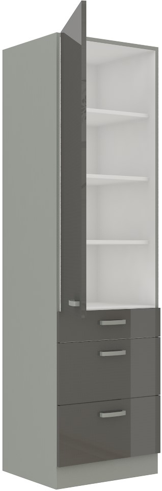 Kuchyňská skříňka STRAKOŠ GREYS G-21 - moderní dřevěná kuchyňská skříňka je určena k vybavení vašich kuchyní a jídelen. Lze ji použít jako jednu ze skříněk při sestavování kuchyňské linky. Součástí skříňky jsou 3 police a 3 šuplíky s plným výsuvem a tichým dovíráním. Dvířka jsou opatřeny panty s tlumičem tichého zavírání, můžete je instalovat jako pravé nebo levé, úchytky je možné namontovat vodorovně nebo svisle.Skříňka je v barevné kombinaci světlé šedé (mat) Platinum Grey - korpus a šedé (vysoký lesk) - dvířka. Vnitřek skřínky je bílý. U úchytek se jedná o leštěný chromový kov, rozteč 128 mm, délka 135 mm.Skříňka je v rozměrech: 600 x 2100 x 570 mm (Š x V x H)Kuchyňská skříňka je dodávána v demontu (2 balíky), montáž je jednoduchá dle přiloženého návodu.Pro zobrazení všech komponentů klikněte zde: komponenty GREYS.Tyto dřevěné kuchyňské skříňky jsou vyrobeny z kvalitně opracované laminované dřevotřískové desky tl. 16 mm s 1 mm ABS hranou.