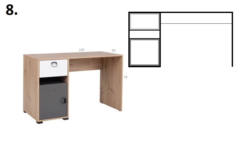 Psací stůl STRAKOŠ K-VIN 8Psací stůl STRAKOŠ K-VIN 8 je součástí studentského / dětského pokoje v systémové sestavě STRAKOŠ K-VIN. Psací stůl využijete jak pro předškoláky tak i pro studenty na PC. Tento stůl je vyroben z laminové desky v kombinovaných barvách dub artisan / grafit / bílá. Rozměry : výška 76 cm, šířka 120 cm, hloubka 55 cm.Počet balíků : 2 Je možné si doobjednat další komponenty STRAKOŠ K-VIN a poskládat si tak vlastní sestavu.Nábytek je dodáván v demontu, montáž je jednoduchá dle přiloženého plánku.