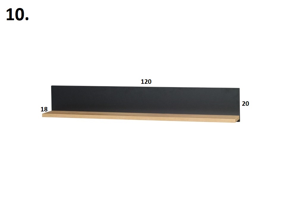 Police STRAKOŠ JO-N 10Police STRAKOŠ JO-N 10 se skvěle hodí jako součást obývací stěny STRAKOŠ JO-N, nebo i kdekoli samostatně.Tato police je vyrobena z laminové desky tl.16mm v barvě Dub Lefkas / černá. Rozměry : výška 20 cm, šířka 120 cm, hloubka 18 cm.Počet balíků : 1Zde se můžete podívat na tuto polici jako součást obývací stěny STRAKOŠ JO-N 01, obývací stěny STRAKOŠ JO-N 02 a obývací stěny STRAKOŠ JO-N 03. Je možné si doobjednat další komponenty STRAKOŠ JO-N a poskládat si tak vlastní sestavu.Nábytek je dodáván v demontu, montáž je jednoduchá dle přiloženého plánku.