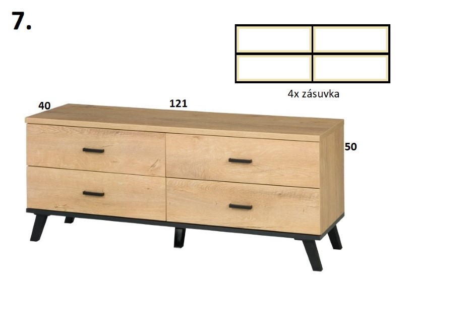TV stolek STRAKOŠ JO-N 7TV stolek STRAKOŠ JO-N 7 se skvěle hodí jako součást obývací stěny STRAKOŠ JO-N.Lze použít jako komoda / odkládací stolek v jídelně, předsíni nebo v ložnici.Tento stolek je vyroben z laminové desky tl.16mm v barvě Dub Lefkas / černá. Rozměry : výška 50 cm, šířka 121 cm, hloubka 40 cm.Počet balíků : 2Zde se můžete podívat na tento TV stolek jako součást obývací stěny STRAKOŠ JO-N 01 a obývací stěny STRAKOŠ JO-N 02. Je možné si doobjednat další komponenty STRAKOŠ JO-N a poskládat si tak vlastní sestavu.Nábytek je dodáván v demontu, montáž je jednoduchá dle přiloženého plánku.