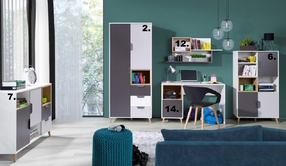 Dětský / Studentský pokoj STRAKOŠ JOK-R 02Sestava STRAKOŠ JOK-R je jednou z moderních a multifunkčních sestav. Je vhodná do menších pokojů, kde využijete mnoho úložného prostoru, ale zároveň se hodí i do prostornějších pokojů. Skládá se z 5 prvků, které jsou volně rozložitelné v prostoru, tím se dokonale přizpůsobí Vašemu interiéru.Skvěle se hodí pro mladistvý styl, ale zaujme kdekoli, díky elegantním nožkám.Tento nábytek je vyroben z laminové desky v kombinovaných barvách bílá / grafit / světlé šedá / dub lefkas .SESTAVA SE SKLÁDÁ Z NÁSLEDUJÍCÍCH DÍLŮ:Skříň STRAKOŠ JOK-R 2 v rozměrech: výška 190 cm, šířka 80 cm, hloubka 55 cm (balík-2)Regál STRAKOŠ JOK-R 6 v rozměrech: výška 140 cm, šířka 80 cm, hloubka 40 cm (balík-1)Komoda STRAKOŠ JOK-R 7 v rozměrech: výška 84 cm, šířka 120 cm, hloubka 40 cm (balík-1)Police STRAKOŠ JOK-R 12 v rozměrech: výška 50 cm, šířka 120 cm, hloubka 25 cm (balík-1)Psací stůl STRAKOŠ JOK-R 14 v rozměrech: výška 76 cm, šířka 120 cm, hloubka 55 cm (balík-1)Prvky této sestavy STRAKOŠ JOK-R lze zakoupit také samostatně.Díky velkému výběru komponentů, si můžete sestavit Vaše pokoje dle Vašich představ.Pro zobrazení komponentů klikněte zde: KOMPONENTY STRAKOŠ JOK-RINFORMACE O BALENÍ:Sestava dodávána v demontu (rozloženém stavu)Součástí je montážní návod včetně potřebných spojovacích materiálůCelkový počet balíků: 6ÚDRŽBA:Sestava je z laminovaného dřevotřískového materiálu, který je odolný a nenáročný na údržbu. Nábytek otírejte hadříkem navlhčeným šetrným a k tomu určeným čistícím prostředkem.