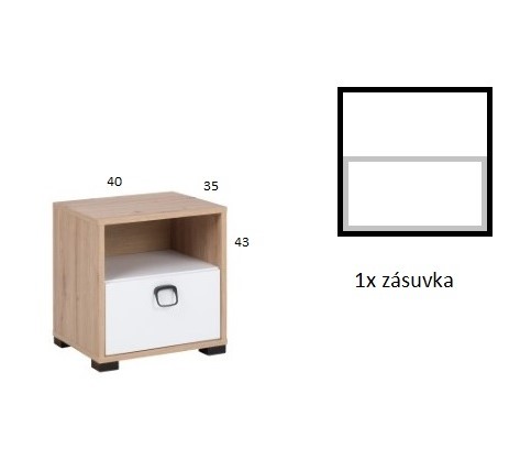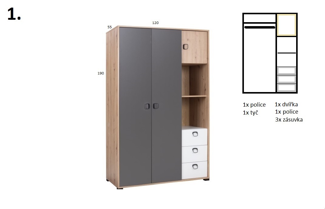 Dětský / Studentský pokoj STRAKOŠ K-VIN 01Sestava STRAKOŠ K-VIN je jednou z moderních a multifunkčních sestav. Je vhodná do menších pokojů, kde využijete mnoho úložného prostoru, ale zároveň se hodí i do prostornějších pokojů. Skládá se ze 4 prvků, které jsou volně rozložitelné v prostoru, tím se dokonale přizpůsobí Vašemu interiéru.Skvěle se hodí pro mladistvý styl, ale zaujme kdekoli.Tento nábytek je vyroben z laminové desky v kombinovaných barvách dub artisan / grafit / bílá . SESTAVA SE SKLÁDÁ Z NÁSLEDUJÍCÍCH DÍLŮ:Skříň STRAKOŠ K-VIN 1 v rozměrech: výška 190 cm, šířka 120 cm, hloubka 55 cm (balík-3)Komoda STRAKOŠ K-VIN 6 v rozměrech: výška 86 cm, šířka 120 cm, hloubka 40 cm (balík-2)Noční stolek STRAKOŠ K-VIN 9 v rozměrech: výška 43 cm, šířka 40 cm, hloubka 35 cm (balík-1)Postel STRAKOŠ K-VIN 11, 90cm v rozměrech: výška 84 cm, šířka 95 cm, délka 204 cm (balík-3)Postel je dodávána včetně roštu, bez matrace, kterou můžete objednat zde: MATRACEPrvky této sestavy STRAKOŠ K-VIN lze zakoupit také samostatně.Díky velkému výběru komponentů, si můžete sestavit Vaše pokoje dle Vašich představ.Pro zobrazení komponentů klikněte zde: KOMPONENTY STRAKOŠ K-VININFORMACE O BALENÍ:Sestava dodávána v demontu (rozloženém stavu)Součástí je montážní návod včetně potřebných spojovacích materiálůCelkový počet balíků: 9ÚDRŽBA:Sestava je z laminovaného dřevotřískového materiálu, který je odolný a nenáročný na údržbu. Nábytek otírejte hadříkem navlhčeným šetrným a k tomu určeným čistícím prostředkem.