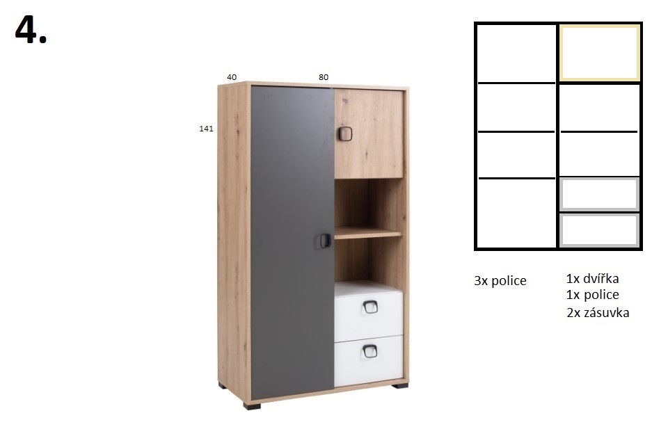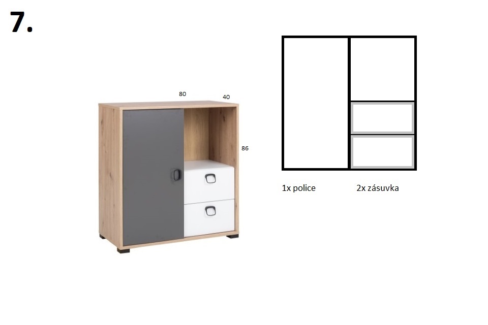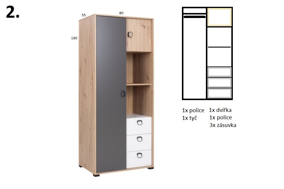 Dětský / Studentský pokoj STRAKOŠ K-VIN 02Sestava STRAKOŠ K-VIN je jednou z moderních a multifunkčních sestav. Je vhodná do menších pokojů, kde využijete mnoho úložného prostoru, ale zároveň se hodí i do prostornějších pokojů. Skládá se z 5 prvků, které jsou volně rozložitelné v prostoru, tím se dokonale přizpůsobí Vašemu interiéru.Skvěle se hodí pro mladistvý styl, ale zaujme kdekoli.Tento nábytek je vyroben z laminové desky v kombinovaných barvách dub artisan / grafit / bílá . SESTAVA SE SKLÁDÁ Z NÁSLEDUJÍCÍCH DÍLŮ:Skříň STRAKOŠ K-VIN 2 v rozměrech: výška 190 cm, šířka 80 cm, hloubka 55 cm (balík-2)Skříň STRAKOŠ K-VIN 4 v rozměrech: výška 141 cm, šířka 80 cm, hloubka 40 cm (balík-2)Komoda STRAKOŠ K-VIN 7 v rozměrech: výška 86 cm, šířka 80 cm, hloubka 40 cm (balík-2)Psací stůl STRAKOŠ K-VIN 8 v rozměrech: výška 76 cm, šířka 120 cm, hloubka 55 cm (balík-2)Police STRAKOŠ K-VIN 10 v rozměrech: výška 30 cm, šířka 110 cm, hloubka 22 cm (balík-1)Prvky této sestavy STRAKOŠ K-VIN lze zakoupit také samostatně.Díky velkému výběru komponentů, si můžete sestavit Vaše pokoje dle Vašich představ.Pro zobrazení komponentů klikněte zde: KOMPONENTY STRAKOŠ K-VININFORMACE O BALENÍ:Sestava dodávána v demontu (rozloženém stavu)Součástí je montážní návod včetně potřebných spojovacích materiálůCelkový počet balíků: 9ÚDRŽBA:Sestava je z laminovaného dřevotřískového materiálu, který je odolný a nenáročný na údržbu. Nábytek otírejte hadříkem navlhčeným šetrným a k tomu určeným čistícím prostředkem.