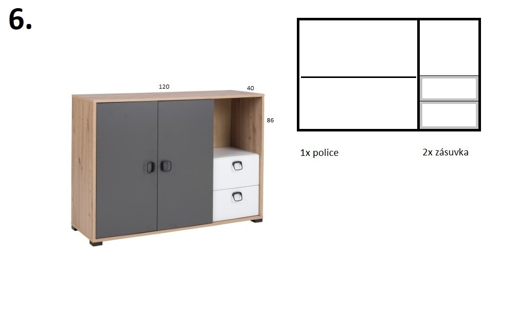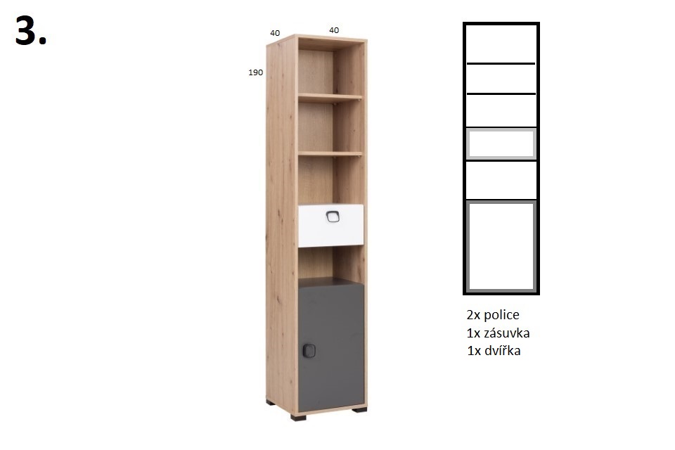 Dětský / Studentský pokoj STRAKOŠ K-VIN 03Sestava STRAKOŠ K-VIN je jednou z moderních a multifunkčních sestav. Je vhodná do menších pokojů, kde využijete mnoho úložného prostoru, ale zároveň se hodí i do prostornějších pokojů. Skládá se z 5 prvků, které jsou volně rozložitelné v prostoru, tím se dokonale přizpůsobí Vašemu interiéru.Skvěle se hodí pro mladistvý styl, ale zaujme kdekoli.Tento nábytek je vyroben z laminové desky v kombinovaných barvách dub artisan / grafit / bílá . SESTAVA SE SKLÁDÁ Z NÁSLEDUJÍCÍCH DÍLŮ:Regál STRAKOŠ K-VIN 3 v rozměrech: výška 190 cm, šířka 40 cm, hloubka 40 cm (balík-2)Skříň STRAKOŠ K-VIN 4 v rozměrech: výška 141 cm, šířka 80 cm, hloubka 40 cm (balík-2)Komoda STRAKOŠ K-VIN 6 v rozměrech: výška 86 cm, šířka 120 cm, hloubka 40 cm (balík-2)Psací stůl STRAKOŠ K-VIN 8 v rozměrech: výška 76 cm, šířka 120 cm, hloubka 55 cm (balík-2)Police STRAKOŠ K-VIN 10 v rozměrech: výška 30 cm, šířka 110 cm, hloubka 22 cm (balík-1)Prvky této sestavy STRAKOŠ K-VIN lze zakoupit také samostatně.Díky velkému výběru komponentů, si můžete sestavit Vaše pokoje dle Vašich představ.Pro zobrazení komponentů klikněte zde: KOMPONENTY STRAKOŠ K-VININFORMACE O BALENÍ:Sestava dodávána v demontu (rozloženém stavu)Součástí je montážní návod včetně potřebných spojovacích materiálůCelkový počet balíků: 9ÚDRŽBA:Sestava je z laminovaného dřevotřískového materiálu, který je odolný a nenáročný na údržbu. Nábytek otírejte hadříkem navlhčeným šetrným a k tomu určeným čistícím prostředkem.