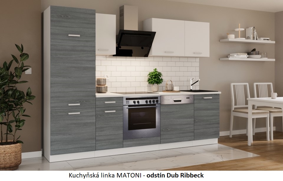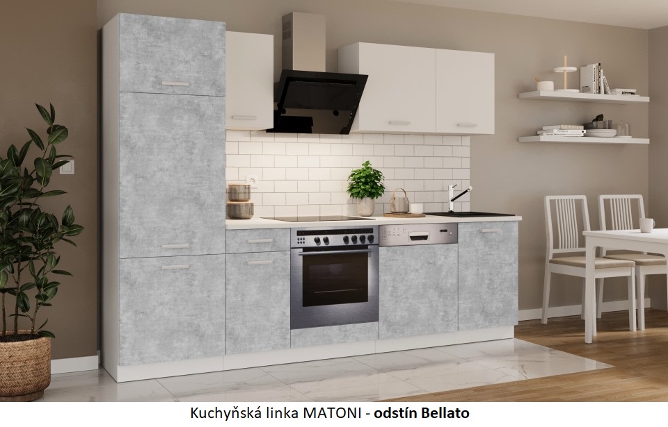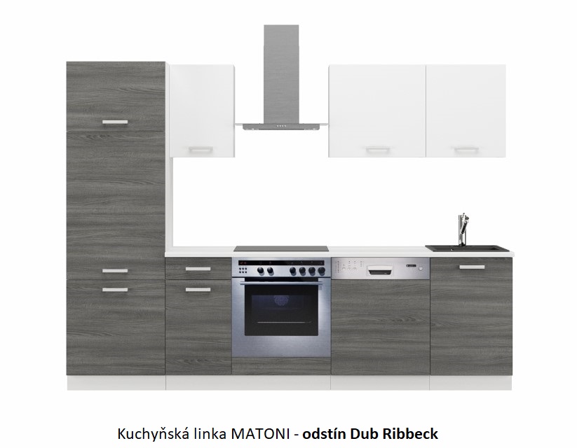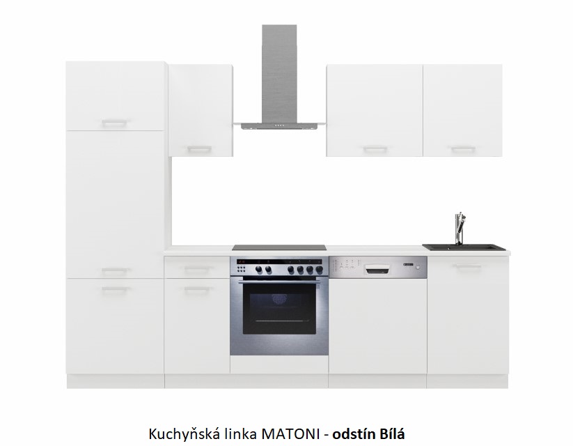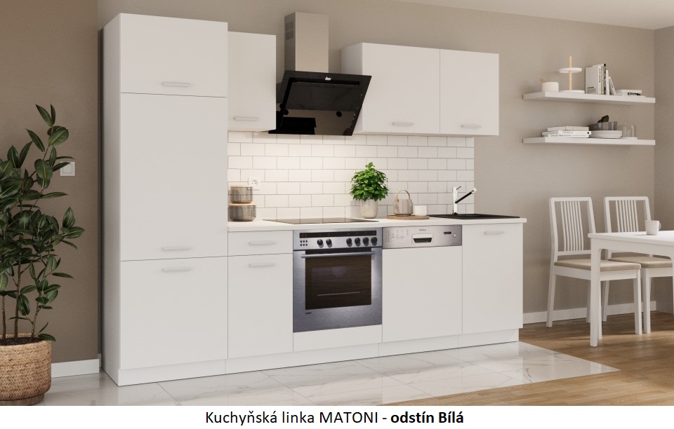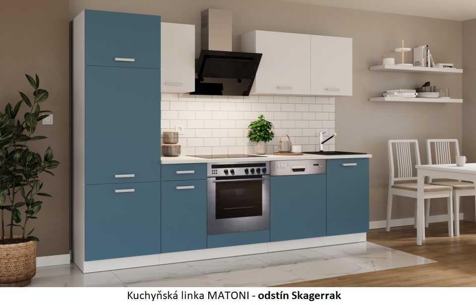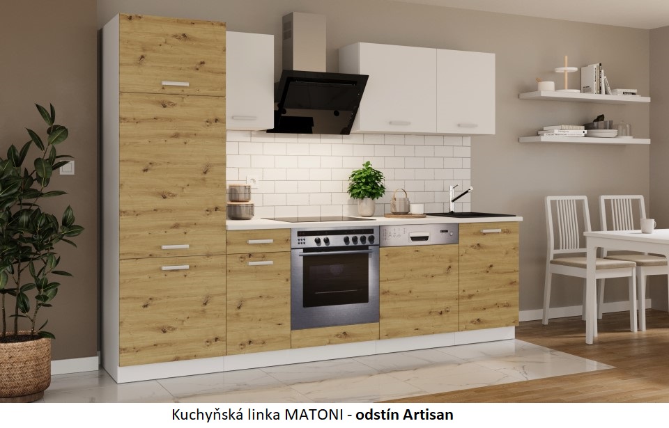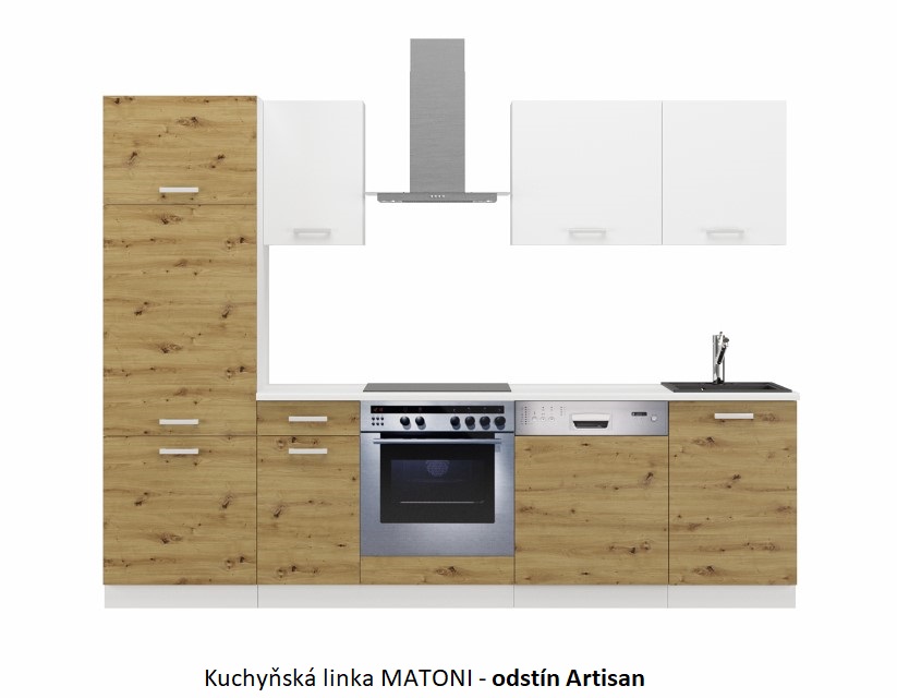 KUCHYŇSKÁ LINKA STRAKOŠ MATONI 270 CM Kuchyňská linka STRAKOŠ MATONI 270 CM spojuje praktičnost a moderní vzhled. Je ideální volbou do Vašich kuchyní nebo jídelen. Převážně oceníte množství úložného prostoru a mezi její největší přednosti patří kompaktní rozměry a výškově nastavitelné nožky spodních dvířek od 13,5 do 16 mm. Vybírat můžete ze 7 krásných moderních odstínů, ať je to dekor dřeva nebo neutrální či výrazné barvy. Skládá se z 8 prvků, které si můžete libovolně poskládat dle Vašich představ a vytvořit tak jedinečnou sestavu kuchyňské linky. Konstrukce je vyrobena z vrstvené dřevotřískové laminátové desky (LTD) o tloušťce 16 mm v bílém provedení a to vč. dvířek horních skříněk. Dvířka spodních skříněk a vysoké skříňky jsou dle zvoleného odstínu. Zakončení hran ABS 1 mm, které slouží k ochraně proti mechanickému poškození a vniku vlhkosti do materiálu. Konstrukce zadní části je tvořena HDF deskou o tloušťce 2,5 mm v bílém provedení. Při montáži dvířek si sami zvolíte stranu jejich otevírání (pravá, levá). Úchytky jsou bílé plastové, jejich rozteč je 128 mm. Kuchyňská linka je dodávána vč. spodního soklu a kuchyňské pracovní desky tl. 28 mm obojí v bílém provedení. Celková rozměry kuchyňské linky: šířka 270 cm, výška: 190 cm, hloubka 56,6 cmJe navržena v 7 barevných provedeních, na výběr máte: 1) Bílá2) Artisan3) Matera4) Labrador5) Bellato6) Skagerrak7) Dub Ribbeck SESTAVA SE SKLÁDÁ Z NÁSLEDUJÍCÍCH DÍLŮ:1) Kuchyňská skříňka vysoká lednicová v rozměrech: šířka 60 cm, výška 190 cm, hloubka 56,6 cm (rozměr lednice do max výšky 880 mm) 2) Kuchyňská skříňka spodní v rozměrech: šířka 40 cm, výška 82 cm, hloubka 56,6 cm3) Kuchyňská skříňka spodní pro vestavěnou troubu v rozměrech: šířka 60 cm, výška 82 cm, hloubka 56,6 cm4) Dvířka pro myčku nádobí s odkrytým předním ovládacím panelem v rozměrech: šířka 60 cm5) Kuchyňská skříňka spodní dřezová v rozměrech: šířka 50 cm, výška 82 cm, hloubka 56,6 cm6) Kuchyňská skříňka vrchni v rozměrech: šířka 40 cm, výška 58 cm, hloubka 30,6 cm7) Kuchyňská skříňka vrchní v rozměrech: šířka 60 cm, výška 58 cm, hloubka 30,6 cm8) Kuchyňská skříňka vrchní v rozměrech: šířka 50 cm, výška 58 cm, hloubka 30,6 cmSestava dodávána bez dřezu, kuchyňských spotřebičů a vodovodní baterie.Pro zobrazení dalších kuchyňských linek klikněte zde: KUCHYŇSKÉ LINKY STRAKOŠ. INFORMACE O BALENÍ: Sestava dodávána v demontu (rozloženém stavu) Součástí je montážní návod včetně potřebných spojovacích materiálů ÚDRŽBA: Sestava je z laminovaného dřevotřískového materiálu, který je odolný a nenáročný na údržbu. Nábytek otírejte hadříkem navlhčeným šetrným a k tomu určeným čistícím prostředkem. Skutečná barevnost odstínu se může lišit dle nastavení Vašeho elektrického zařízení a není důvodem k reklamaci.