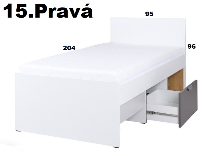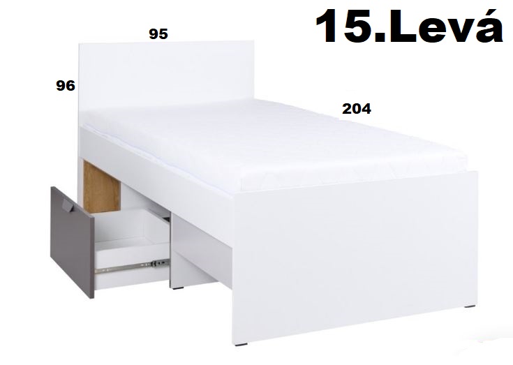 Postel STRAKOŠ JOK-R 15Postel STRAKOŠ JOK-R 15, 90cm je součástí studentského / dětského pokoje v systémové sestavě STRAKOŠ JOK-RPostel lze použít i samostatně. Můžete ji využít i do hotelových pokojů či penzionů.Provedení : levé / pravéPostel je dodávána včetně roštu, bez matrace, kterou můžete objednat zde: MATRACETato postel je vyrobena z laminové desky v kombinovaných barvách bílá / grafit / světle šedá / dub lefkas.Rozměry: výška 96 cm , šířka 95 cm, délka 204 cmPočet balíků : 3Výběr komponentů systémového nábytku: STRAKOŠ JOK-RNábytek je dodáván v demontu, montáž je jednoduchá dle přiloženého plánku.