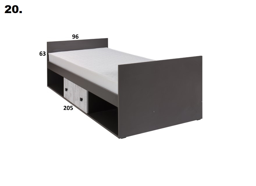 Postel STRAKOŠ TOM-Y 20Postel STRAKOŠ TOM-Y 20, 90cm je součástí studentského / dětského pokoje v systémové sestavě STRAKOŠ TOM-Y.Postel lze použít i samostatně. Můžete ji využít i do hotelových pokojů či penzionů.Univerzální provedení : levé / pravéPostel je dodávána včetně roštu, bez matrace, kterou můžete objednat zde: MATRACE.Tato postel je vyrobena z laminové desky v kombinovaných barvách grafit / enigma.Rozměry: výška 63 cm , šířka 96 cm, délka 205 cmPočet balíků : 3Výběr komponentů systémového nábytku: STRAKOŠ TOM-YNábytek je dodáván v demontu, montáž je jednoduchá dle přiloženého plánku.
