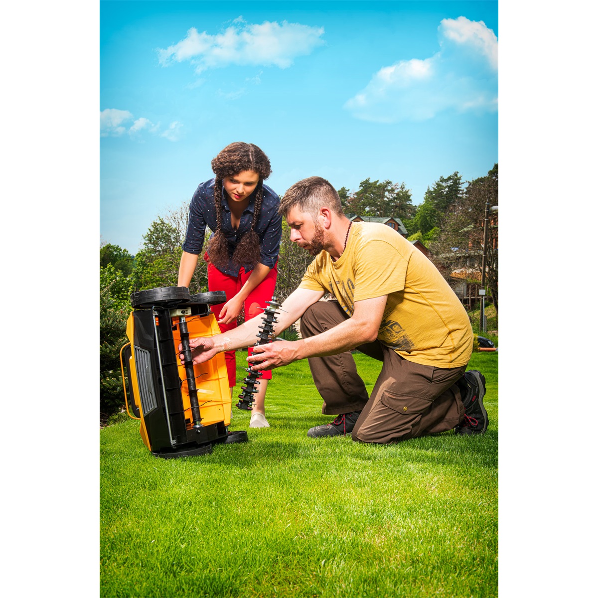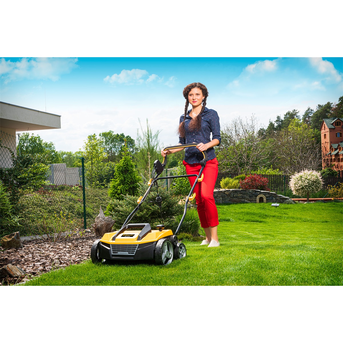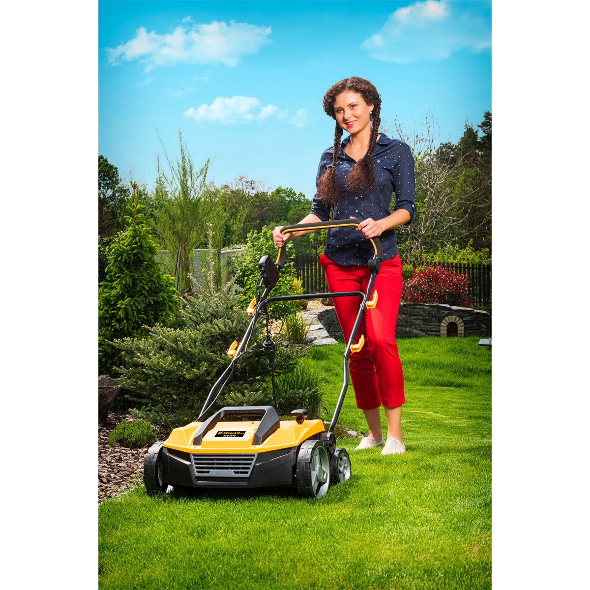 stroj je vybaven dvěma snadno vyměnitelnými válci – válcem s drátky na vyčesání staré trávy, plevelů, mechů apod. a válcem s noži, který navíc profrézuje půdu ještě více do hloubky