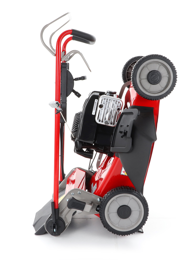 Novinkou sekačky je funkce tzv. "CHYTRÉ ŘEŠENÍ", sekačku lze pro ekonomické uskladnění, snadné čištění, servisování otočit a postavit na zadní speciální patky šasí, tímto se snadno dostanete na spodní část žacího ústrojí, uložení náprav a převodovku.