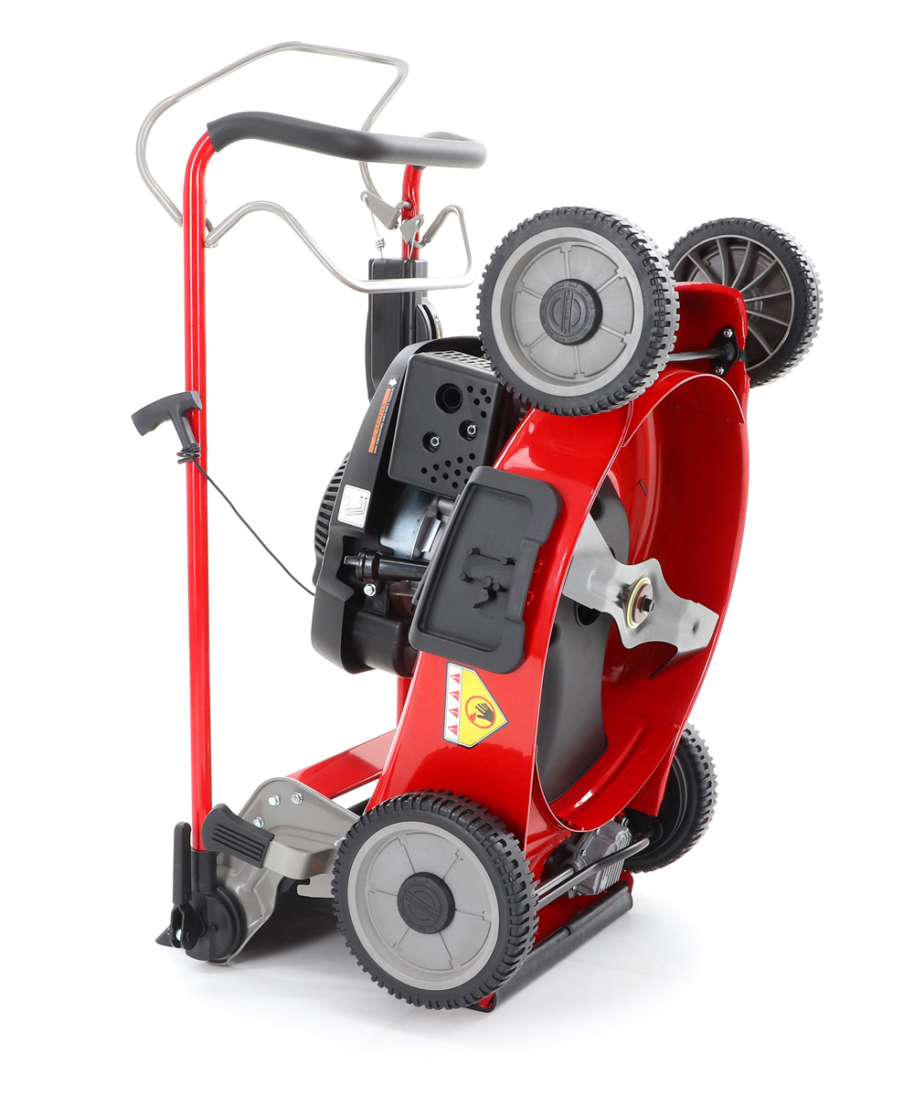 Novinkou sekačky je funkce tzv. "CHYTRÉ ŘEŠENÍ", sekačku lze pro ekonomické uskladnění, snadné čištění, servisování otočit a postavit na zadní speciální patky šasí, tímto se snadno dostanete na spodní část žacího ústrojí, uložení náprav a převodovku.