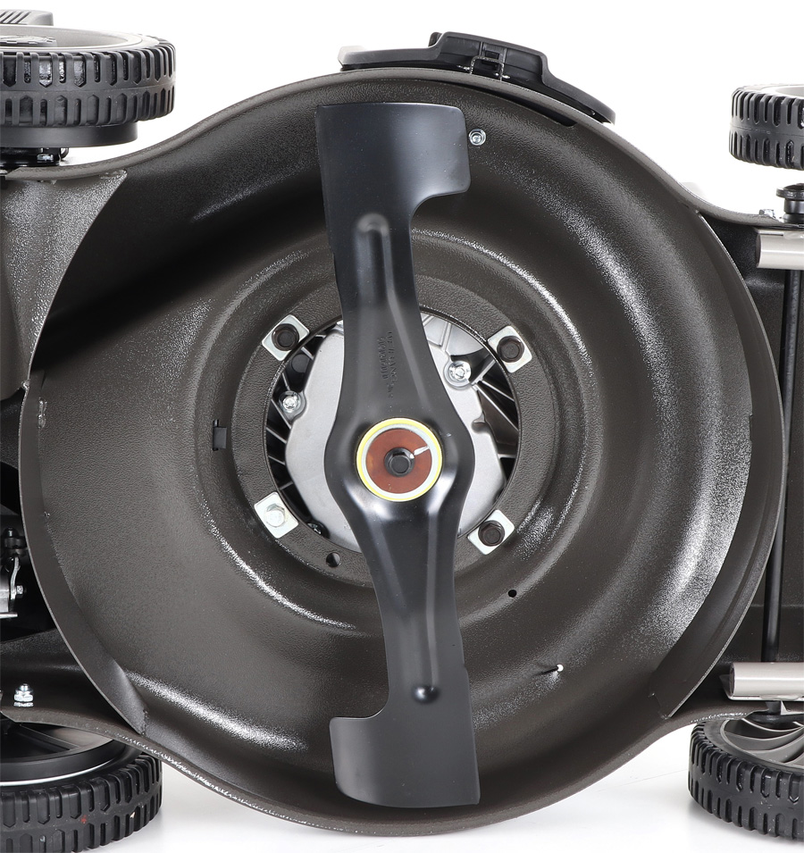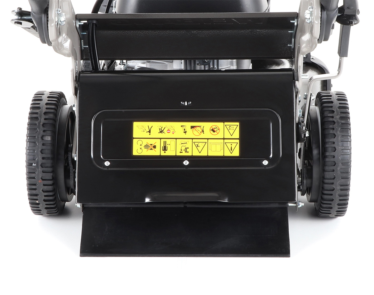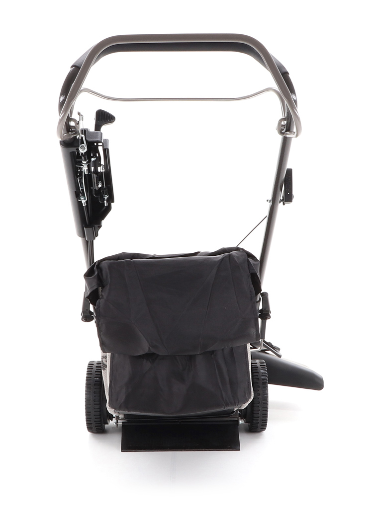 Pogumovaná sendvičová kola jsou uložena v oboustranných kuličkových ložiscích, centrální nastavení výšky sečení je u této značky samozřejmostí. Velkým nadstandardem u této sekačky je použita speciální třecí spojka na noži sekačky pod unášečem, která je schopna prokluzu nože při naražení do pevné překážky. Tato funkce může eliminovat škody na sekačce způsobené nárazem nože do překážky. Ergonomická rukojeť s ovládacími prvky otáček motoru a speciální povlak na obvodu sběracího koše, který stimuluje proud vzduchu, aby se neprášilo na obsluhu.