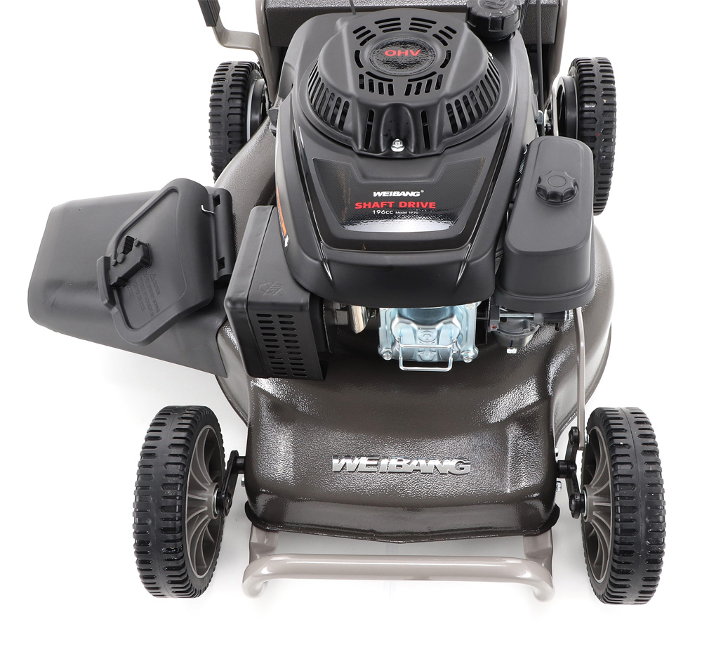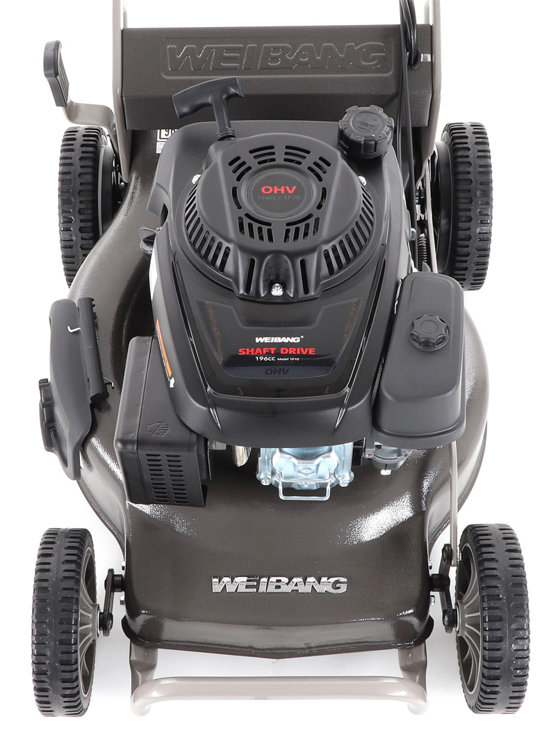 Dále je tato sekačka vybavena pevnými zadními koly a sklopnou rukojetí pro snadné uskladnění a přepravu. Masivní žačí nůž s mohutnými vyhazovacími "lopatami - tzv. BIG BLADE" a velký koš spolu se zajímavou cenou dělají z této sekačky WEIBANG WB 507 SCV kvalitního pomocníka s bojem proti zelenému živlu v běžném i profesionální težkém nasazení. Dalším velkým unikátem je motor, který patří mezi to nejlepší co výrobce WEIBANG v této třídě nabízí. Jedná se o profesionální silný motor rozvodu OHV o výkonu 7 HP a vysokým kroutícím momentem 10,5 Nm. Velkou výhodou této sekačky WEIBANG WB 507 SCV 6in1 je řešení pojezdu za pomocí hřídelového kardanového pohonu. Jedná se o unikátní bezztrátovou technologii pojezdu, bez použití klínového řemene. Tímto odpadají problémy s klínovým řemen, čištění spodní části sekačky atd. Hřídelový kardanový pohon je bezúdržbový s podstatně delší životností.