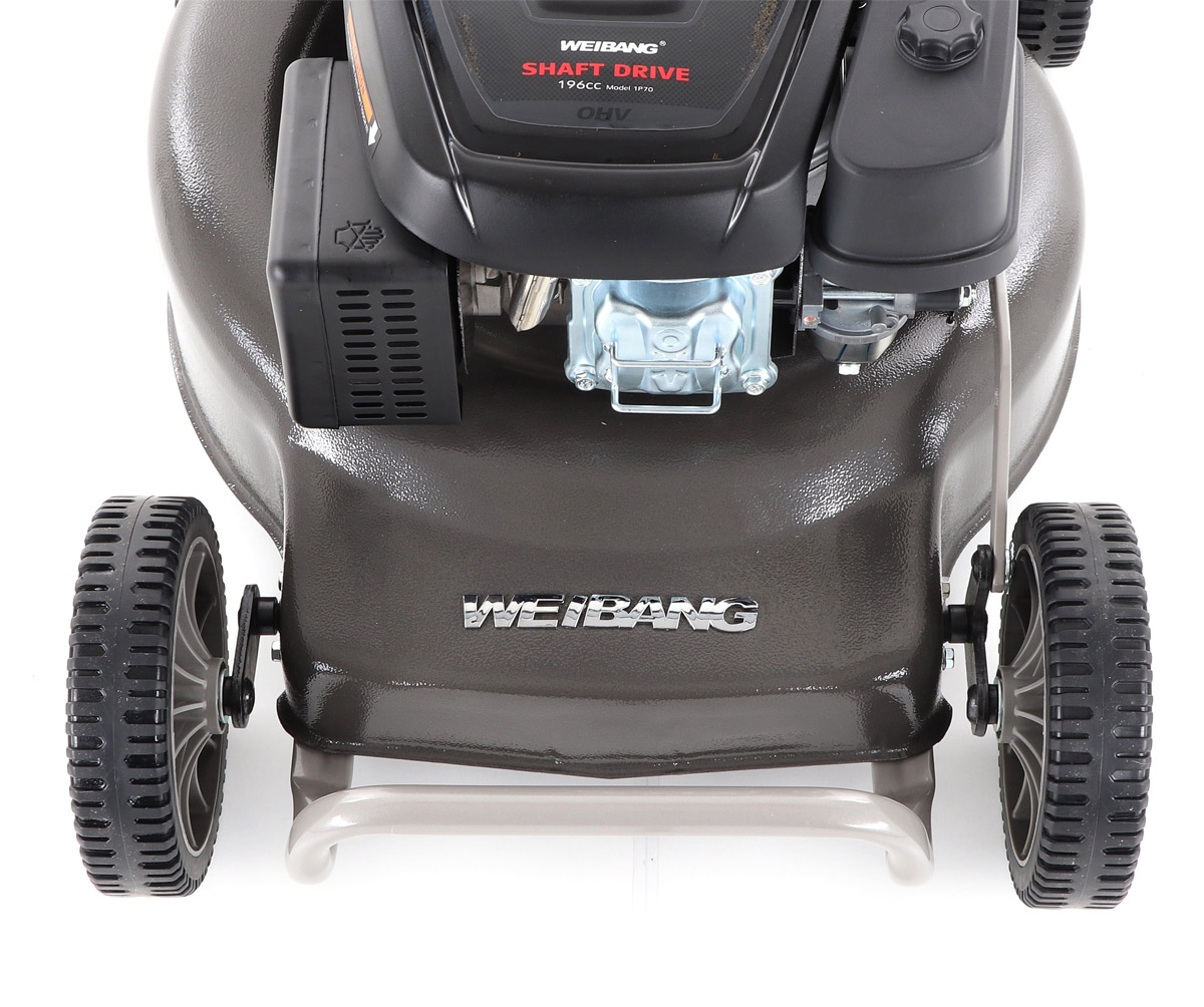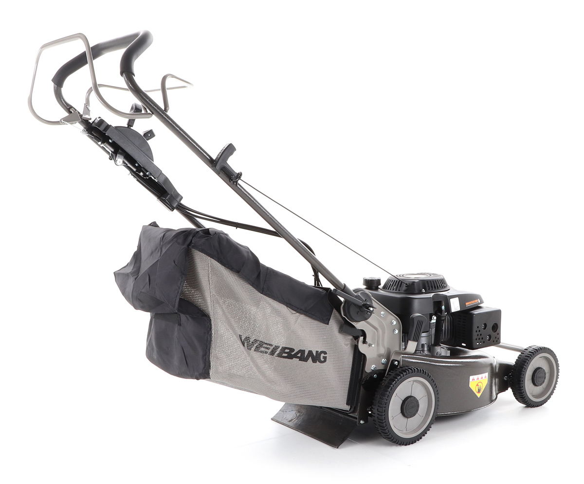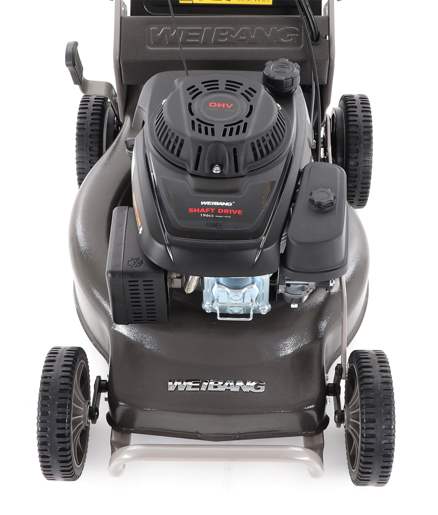 Dále je tato sekačka vybavena pevnými zadními koly a sklopnou rukojetí pro snadné uskladnění a přepravu. Masivní žačí nůž s mohutnými vyhazovacími "lopatami - tzv. BIG BLADE" a velký koš spolu se zajímavou cenou dělají z této sekačky WEIBANG WB 507 SCV kvalitního pomocníka s bojem proti zelenému živlu v běžném i profesionální težkém nasazení. Dalším velkým unikátem je motor, který patří mezi to nejlepší co výrobce WEIBANG v této třídě nabízí. Jedná se o profesionální silný motor rozvodu OHV o výkonu 7 HP a vysokým kroutícím momentem 10,5 Nm. Velkou výhodou této sekačky WEIBANG WB 507 SCV je řešení pojezdu za pomocí hřídelového kardanového pohonu. Jedná se o unikátní bezztrátovou technologii pojezdu, bez použití klínového řemene.