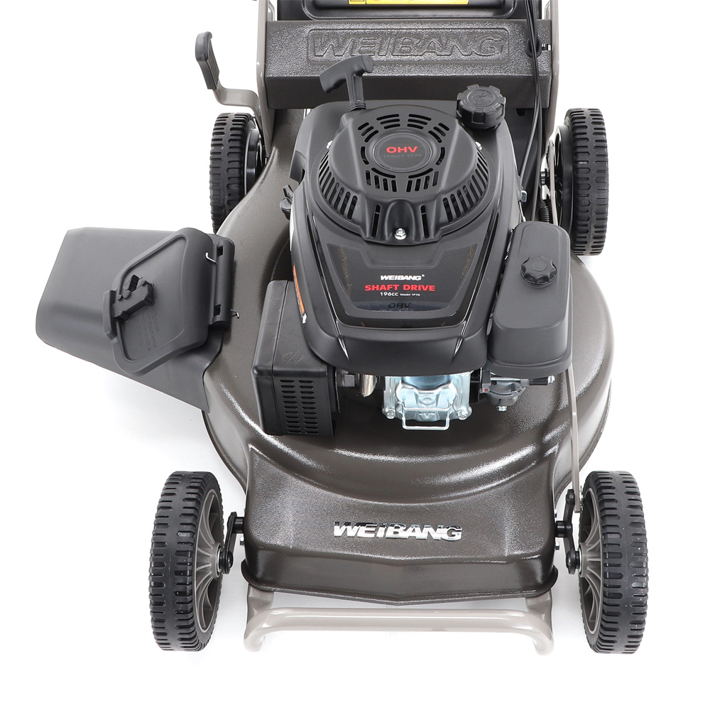 Dále je tato sekačka vybavena pevnými zadními koly a sklopnou rukojetí pro snadné uskladnění a přepravu. Masivní žačí nůž s mohutnými vyhazovacími "lopatami - tzv. BIG BLADE" a velký koš spolu se zajímavou cenou dělají z této sekačky WEIBANG WB 537 SCV kvalitního pomocníka s bojem proti zelenému živlu v běžném i profesionální težkém nasazení. Dalším velkým unikátem je motor, který patří mezi to nejlepší co výrobce WEIBANG v této třídě nabízí. Jedná se o profesionální silný motor rozvodu OHV o výkonu 7 HP a vysokým kroutícím momentem 10,5 Nm. Velkou výhodou této sekačky WEIBANG WB 537 SCV 6in1 je řešení pojezdu za pomocí hřídelového kardanového pohonu. Jedná se o unikátní bezztrátovou technologii pojezdu, bez použití klínového řemene.
