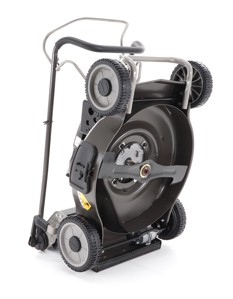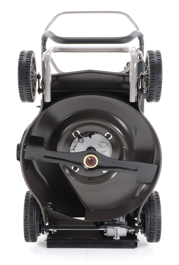 Novinkou sekačky je funkce tzv. "CHYTRÉ ŘEŠENÍ", sekačku lze pro ekonomické uskladnění, snadné čištění, servisování otočit a postavit na zadní speciální patky šasí, tímto se snadno dostanete na spodní část žacího ústrojí, uložení náprav a převodovku.