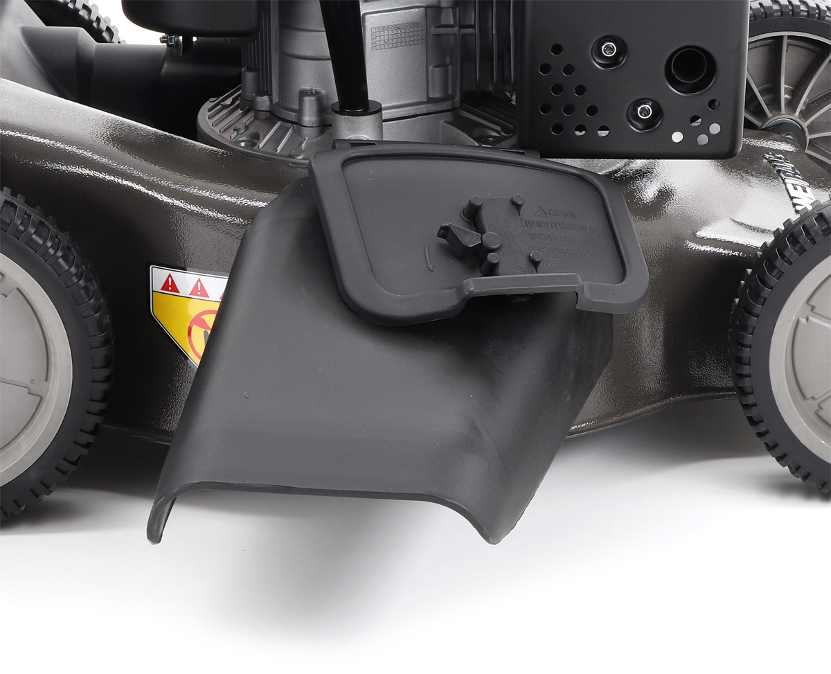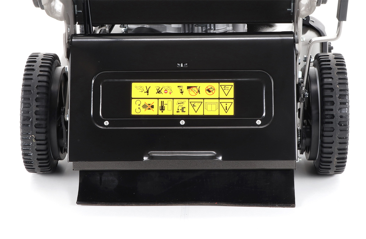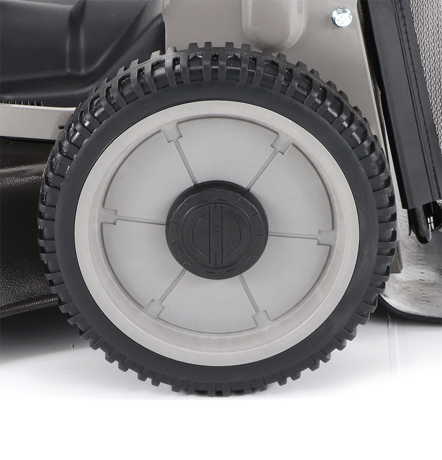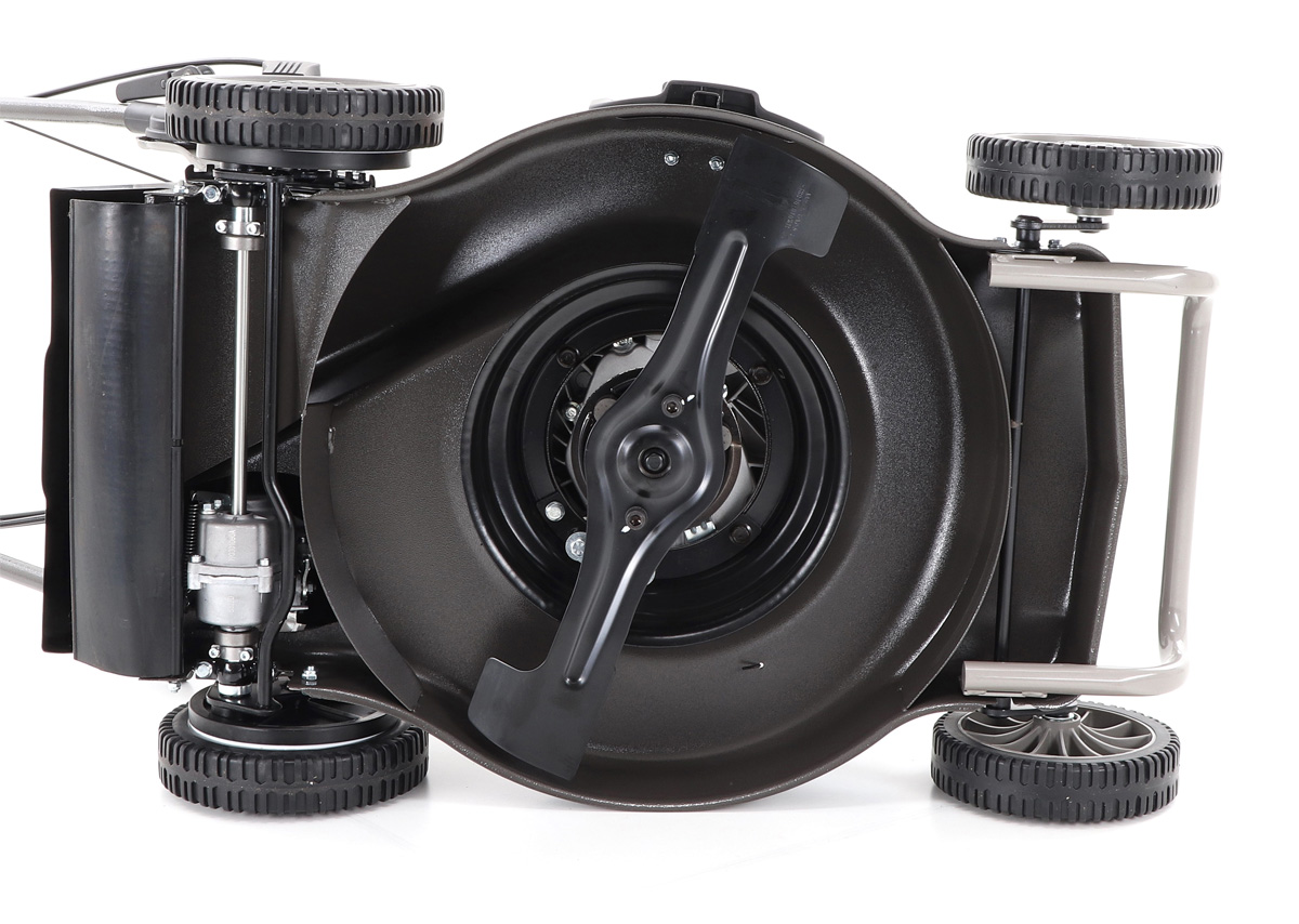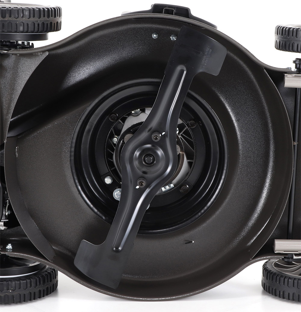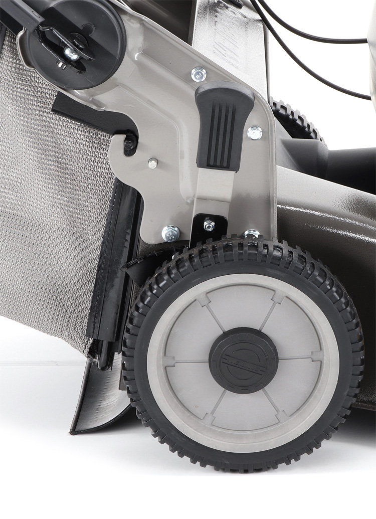 Pogumovaná sendvičová AL kola jsou uložena v oboustranných kuličkových ložiscích, centrální nastavení výšky sečení je u této značky samozřejmostí. Velkým nadstandardem u této sekačky je použita speciální profi BBC spojka nože, která je schopna vypínat i zapínat žací nůž i při trvalém běhu motoru.Tato funkce může eliminovat škody na sekačce způsobené nárazem nože do překážky. Ergonomická rukojeť s ovládacími prvky otáček motoru a speciální povlak na obvodu sběracího koše, který stimuluje proud vzduchu, aby se neprášilo na obsluhu.