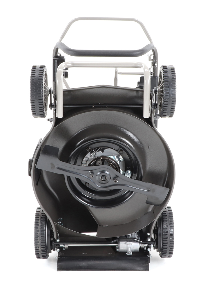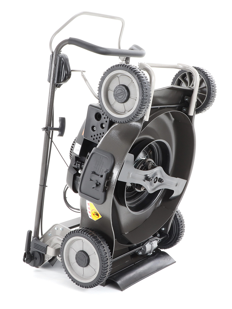 Novinkou sekačky je funkce tzv. "CHYTRÉ ŘEŠENÍ", sekačku lze pro ekonomické uskladnění, snadné čištění, servisování otočit a postavit na zadní speciální patky šasí, tímto se snadno dostanete na spodní část žacího ústrojí, uložení náprav a převodovku.
