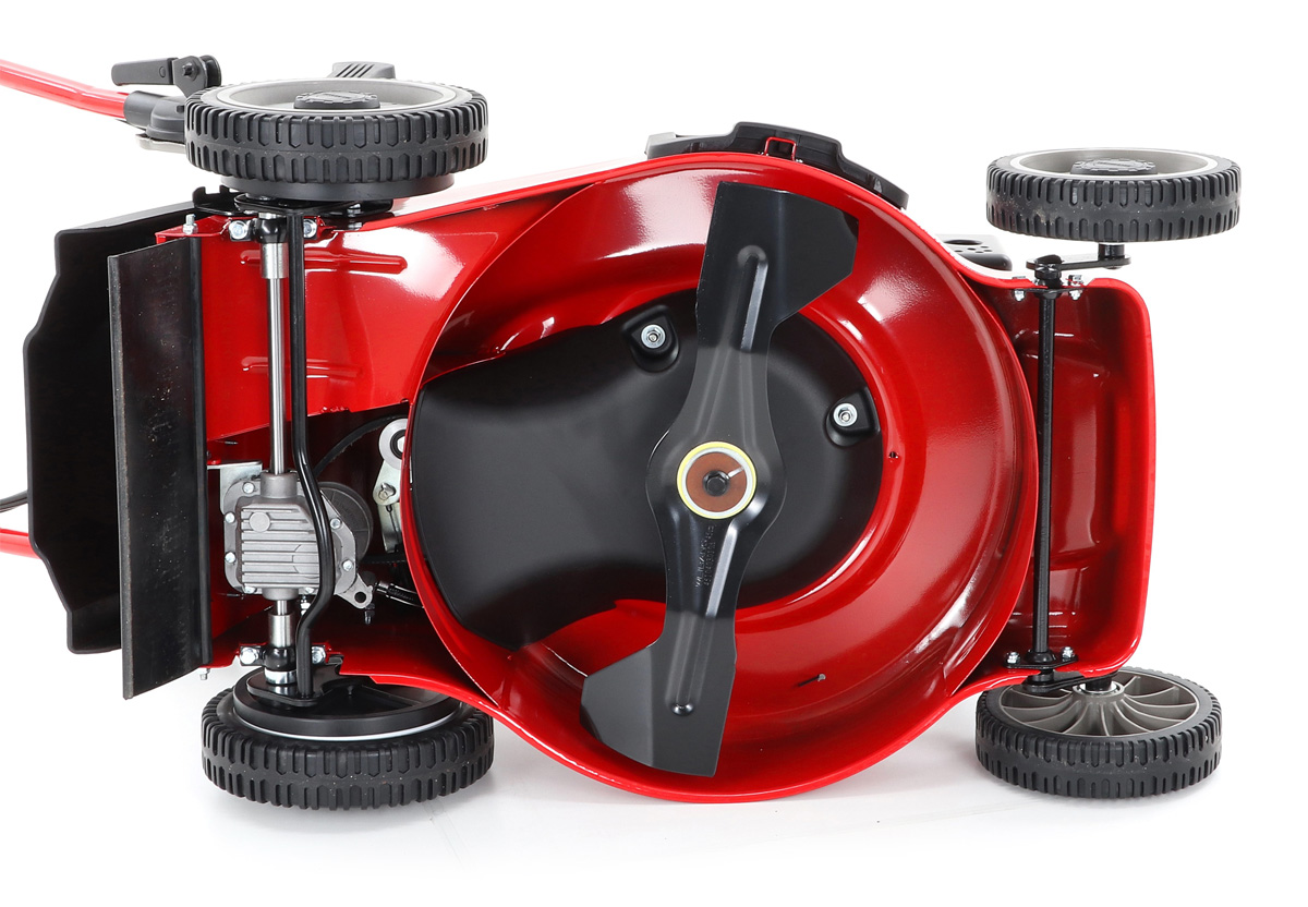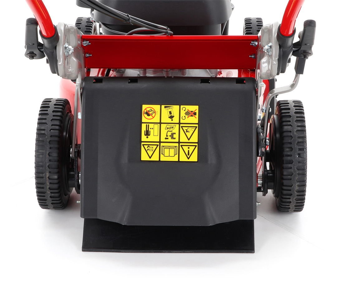 Pogumovaná sendvičová kola jsou uložena v oboustranných kuličkových ložiscích, centrální nastavení výšky sečení je u této značky samozřejmostí. Velkým nadstandardem u této sekačky je použita speciální třecí spojka na noži sekačky pod unášečem, která je schopna prokluzu nože při naražení do pevné překážky. Tato funkce může eliminovat škody na sekačce způsobené nárazem nože do překážky. Ergonomická rukojeť s ovládacími prvky otáček motoru a speciální povlak na obvodu sběracího koše, který stimuluje proud vzduchu, aby se neprášilo na obsluhu.