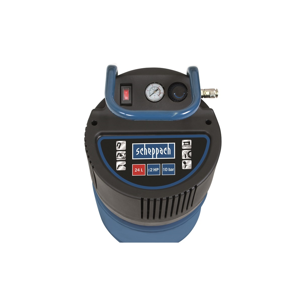 Vertikální kompresor Scheppach HC 24 V je prostorově velmi úsporný stroj, který má díky použití moderního motoru s bezolejovou technologií rovněž minimální nároky na údržbu. To ho staví do role ideálního kompresoru pro běžné domácí využití a do stísněných dílen a garáží. Tlaková nádoba slouží jako zásobárna stlačeného vzduchu a motor se tak zapíná jen v případě, že tlak vzduchu klesne pod požadovanou úroveň. Díky vzdušníku můžete s kompresorem provádět i náročnější operace, než je běžné huštění. Můžete k němu připojit třeba sponkovačku, stříkací pistoli (airbrush), ofukovací pistoli a další vzduchové nářadí. Při dofukování pneumatik zase oceníte jednoduché nastavení výše tlaku, který můžete snadno kontrolovat pomocí vestavěného manometru. Díky bezolejové technologii se dobře hodí i k udržování tlaku v pivních sudech. Přídavná rukojeť, nízká hmotnost a kompaktní rozměry umožní snadnou manipulaci se strojem. Podmínkou výrobce na uplatnnění prodloužené záruky 48 měsíců je placený servis stroje ve 24 měsíci od zakoupení v autorizovaném servisu Scheppach.