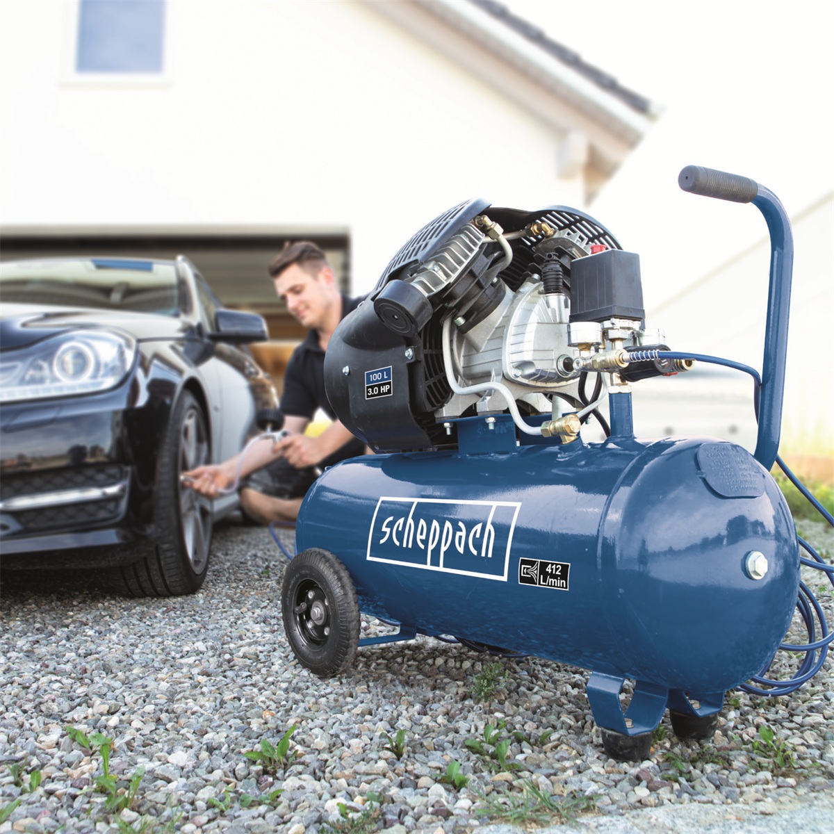 Kompresor Scheppach HC 120 DC je skvělým řešením pro velmi náročné uživatele. Díky tlaku až 10 bar a velkému obsahu vzdušníku 100 l se hodí hlavně tam, kde je potřebná dostatečná zásoba tlakového vzduchu, například k pohonu široké škály pneumatických nástrojů, jako jsou vrtačky, rázové utahováky, sponkovačky, stříkací pistole a podobně. Pro snadnou výměnu nástrojů jsou oba výstupy opatřeny rychlospojkami. O rychlé natlakování a vysoký sací výkon 412 l/min. se stará výkonná dvouválcová jednotka o výkonu 3 PS. Ta je mazána olejem a díky dvouválcové technologii se vyznačuje velmi dlouhou životností. Snadnou manipulaci se strojem zajišťuje velké madlo a vzduchem plněné pneumatiky.