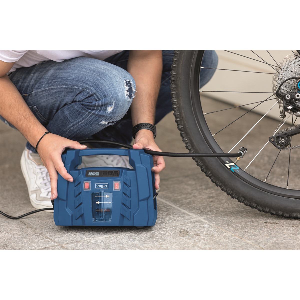 Kompresor Scheppach AIR FORCE 5 je malý, ale užitečný pomocník, kterého můžete napájet jak z běžné sítě na 230 V, tak i z běžné automobilové zásuvky na 12 V. Uplatní se tak nejenom jako praktický, skladný, a lehký kompresor ve vaší dílně nebo garáži, ale využijete ho i na cestách v autě nebo karavanu. Obsluha je velmi jednoduchá. Na digitálním displeji vidíte aktuální hodnotu tlaku. Ten si jde rovněž v rozmezí 0,1 až 8 bar předvolit a po dosažení nastaveného tlaku se kompresor automaticky vypne. Díky velkému množství různých koncovek a maximálnímu tlaku až 8 barů si hravě poradí s foukáním pneumatik motocyklů, kol, aut, terénních čtyřkolek, míčů, matrací, nafukovacích člunů, raftů apod. Veškeré příslušenství, včetně dvou elektrických kabelů, tlakové hadice 0,6 m a čtyř různých koncovek je chytře ukryto uvnitř kompresoru, takže se Vám nic neztratí. Pohodlné madlo usnadní přenášení. Kompresor je vybavený nejmodernějším motorem s bezolejovou technologií. Kontrola oleje, jeho doplňování nebo výměna tak vůbec není potřeba a kompresor je tak vždy připravený odvést svoji práci. Jeho rozměry a váha pouhých 1,9 kg ho rovněž předurčují k využití při stanování, kempování a jiných outdoorových aktivitách.