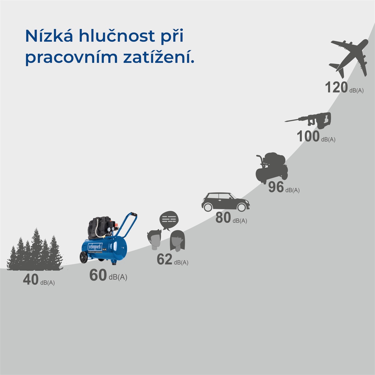 Kompresor Scheppach HC 51 Si je tichý bezolejový dvouválcový kompresor, který je vhodný i do míst a provozů s vysokými požadavky na nízkou míru hluku. Hlučnost 60 dB (A) znamená hladinu hluku zhruba na úrovni bublání varné konvice, takže v praxi budete vnímat hluk tohoto kompresoru pouze minimálně. Další výhodou je bezolejová technologie, která znamená, že do vzdušníku ani dále do spotřebiče vzduchu, neunikají žádné olejové páry. To se hodí v potravinářství, u speciálních lakýrnických prací nebo třeba při tlakování výčepních zařízení. Bezolejová technologie znamená rovněž mnohem nižší nároky na údržbu celého stroje. Scheppach rovněž odstranil běžnou nevýhodu tichých kompresorů, a to poměrně nízký sací výkon. Díky nové technologii je sací výkon 300 l/min téměř dvakrát vyšší, než je běžné a je plně srovnatelný s klasickými kompresory. Velký vzdušník o objemu 50 l slouží jako zásobárna stlačeného vzduchu a motor se tak automaticky zapíná jen v případě, že tlak vzduchu klesne pod požadovanou úroveň. Vzdušník rovněž výrazně rozšiřuje možnosti kompresoru a stroj se tak stává opravdu multifunkčním pomocníkem. Díky němu můžete s kompresorem, mimo běžného huštění a ofukování, provádět i náročnější operace s použitím různých druhů pneumatického nářadí (sponkovačka, hřebíkovačka, apod). Kompresor je vybaven manometrem vzdušníku i manometrem pro kontrolu pracovního tlaku. Přídavné madlo a kolečka umožní snadnou manipulaci se strojem, antivibrační podstavec zase zajistí klidný chod stroje.