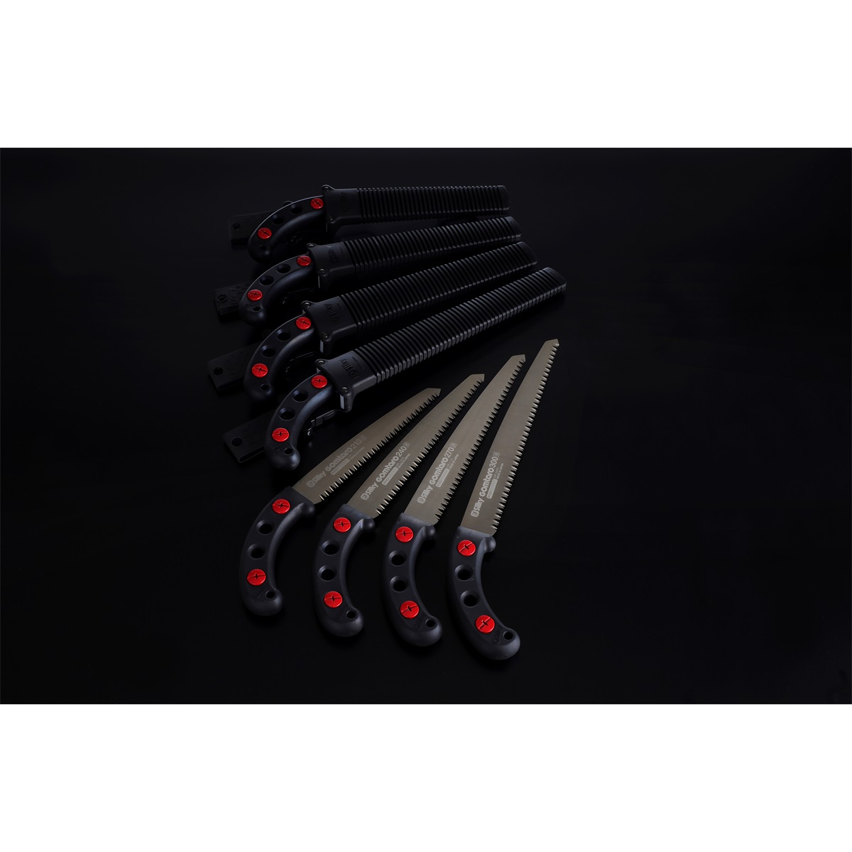 Gomtaro s jemnými zuby počet 13 zubů na 30 mm poznáte podle stříbrných šroubů na rukojeti. Jemné zuby jsou vhodné pro vyzrálé nebo tvrdé dřevo, jako většina ovocných stromů. Gomtaro Pro-Sentei má na čepeli hned dvě velikosti zubů, což ji činí výjimečnou pilou. Jemné zuby na konci čepele jsou ideální pro řezání malých větviček, takže nemusíte tak často přepínat mezi pilou a zahradnickými nůžkami. Tyto jemné zuby lze také použít k vytvoření podřezu nebo k zahájení řezu, po němž můžete rychle pokračovat v řezání dřeva s většími zuby na čepeli.