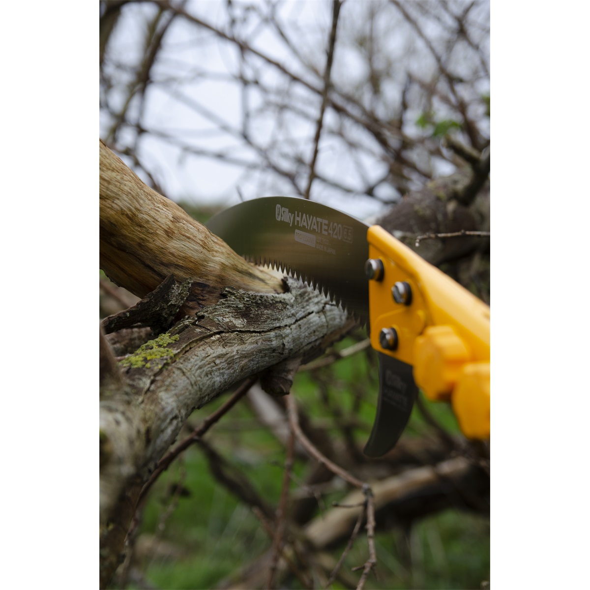Skutečná heavy duty pila určená speciálně pro profesionály. Hayate má velmi robustní konstrukci, což z ní činí nejodolnější pilu z celé řady teleskopických pil Silky. Čepel má unikátní zuby Mirai-Me od Silky a na začátku a konci čepele dvě velká srpovitá ostří. Horní zakřivení udržuje čepel ve střihu, zatímco spodní ostří usnadňuje podřezávání kůry. Dolní ostří lze v případě potřeby demontovat.