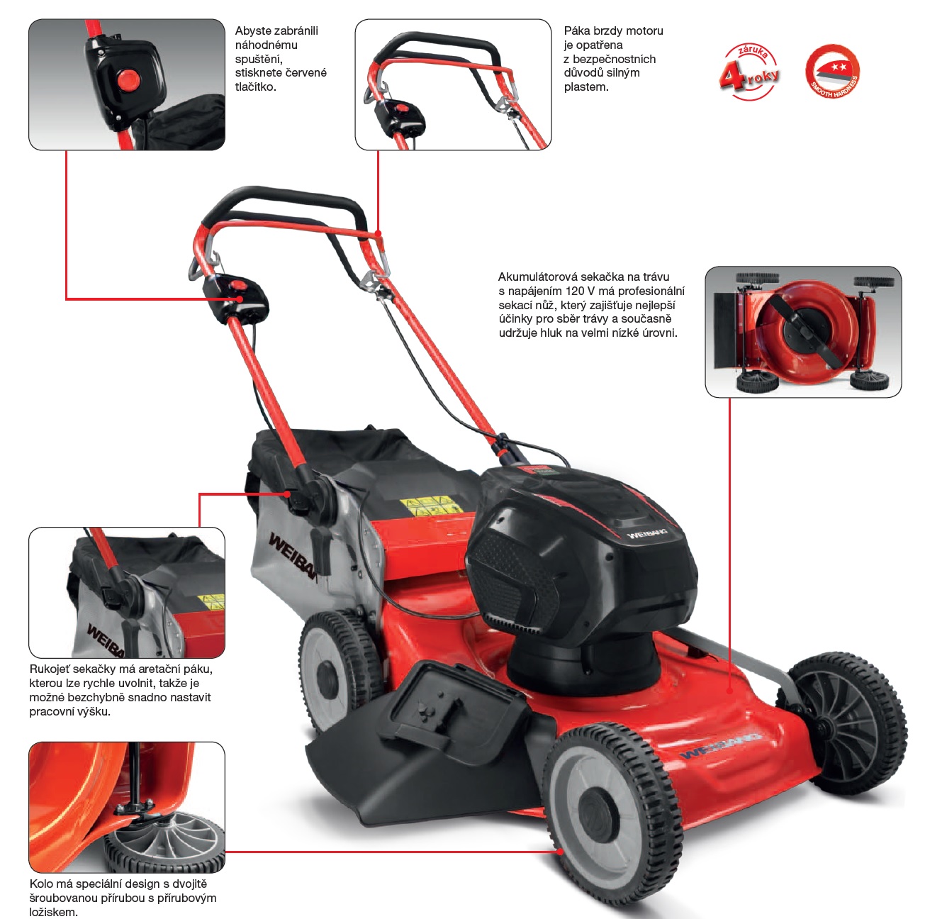 Tyto poslední funkce se používají převážně na přerostlou trávu. Kola je ze speciální pryže jsou uložena v oboustraných kuličkových ložiscích, centrální nastavení výšky sečení je u značky WEIBANG také samozřejmostí.