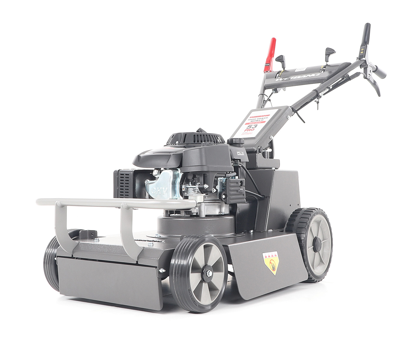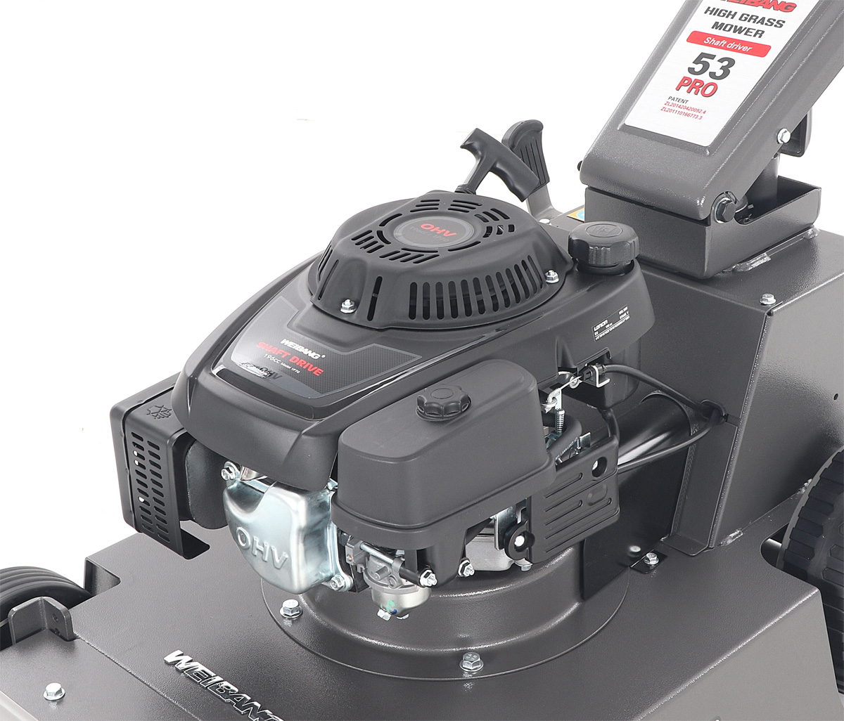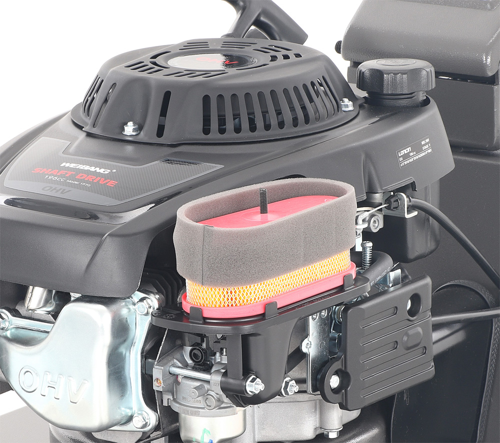 Tato funkce může eliminovat škody na sekačce způsobené nárazem nože do překážky. Dále je tato sekačka vybavena pevnými zadními koly a sklopnou rukojetí pro snadné uskladnění a přepravu. Dalším velkým unikátem je motor, který patří mezi to nejlepší a nejsilnější co WEIBANG v této třídě nabízí. Jedná se o profesionální hodně silný motor rozvodu OHV s vysokým kroutícím momentem 10,5 Nm - 196 ccm.