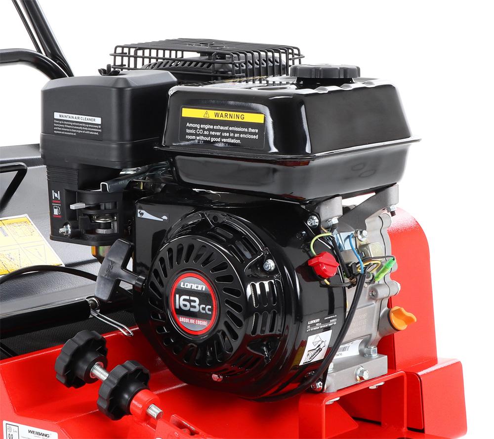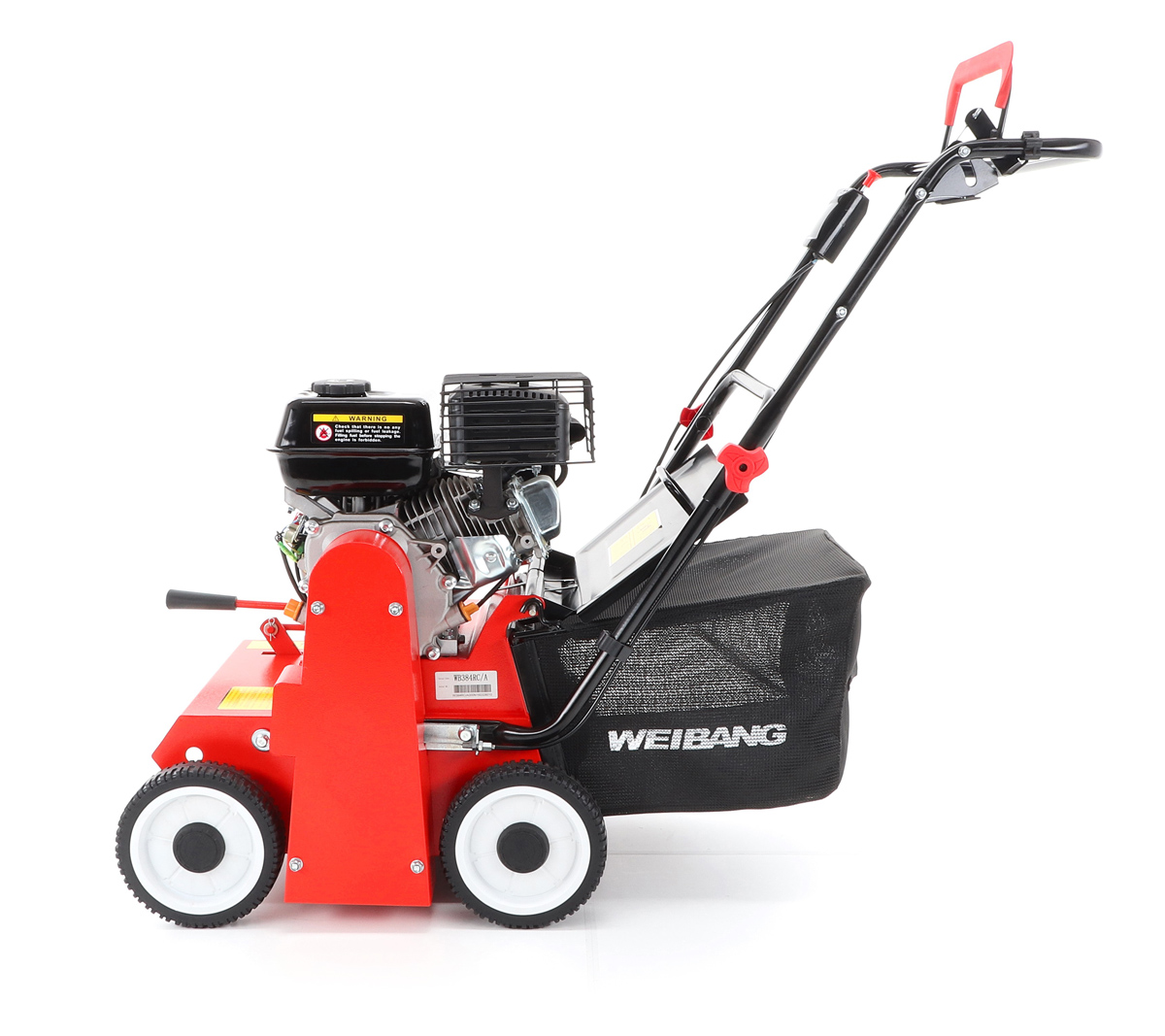 Motorový provzdušňovač trávníků WEIBANG 384 RC s motorem Loncin OHV 163 ccm, 5Hp, šířka pracovního záběru je 380 mm, plynulé centrální nastavením výšky, robusní šasi z vysokojakostní oceli, sběrný koš o objemu 40l. Hřídel je osazena 22 profesionálními flexi noži - tato konstrukce eliminuje možné poškození nožů nebo celé hřídele. Hřídel je uložena v masivních ložiscích. Hmotnost provzdušňovače je 46 kg.
