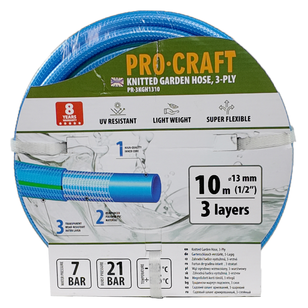 Zahradní hadice Procraft je určena k zalévání a zavlažování zahrad, pozemků. Zesílená třívrstvá zahradní hadice s tkanou výztuhou má vysokou životnost až 8 let. Kvalitní zpracovaní hadice zajišťuje vysokou odolnost UV záření, povětrnostním vlivům a proti teplotám (-10 až +65). Hadice je velmi flexibilní, robustní a odolná proti zlomení.