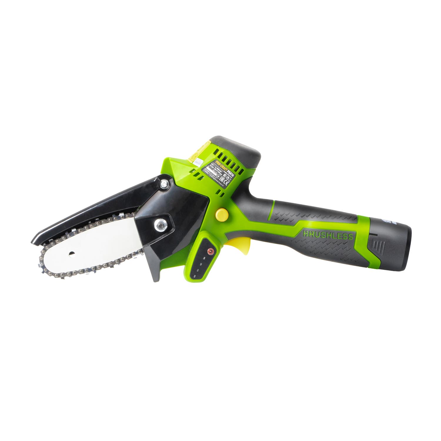 AKU jednoruční řetězová pila je díky svým kompaktním rozměrům užitečným pomocníkem při prořezávání stromů a keřů při práci v omezeném prostoru. Její provoz je v porovnání s většími stroji tichý a díky bezuhlíkovému (Brushless) motoru dostatečně výkonný. Je vybavena bezpečnostním krytem pilového řetězu. Stroj je dodávaný včetně vodící lišty a pilového řetězu v kartonu s montážním klíčem, nádobou na mazací olej a 2 akumulátorů 2Ah, 16V a nabíječkou. Lze za dostupnnou cenu dokoupit náhradní pilový řetěz pod označním RPKA16
